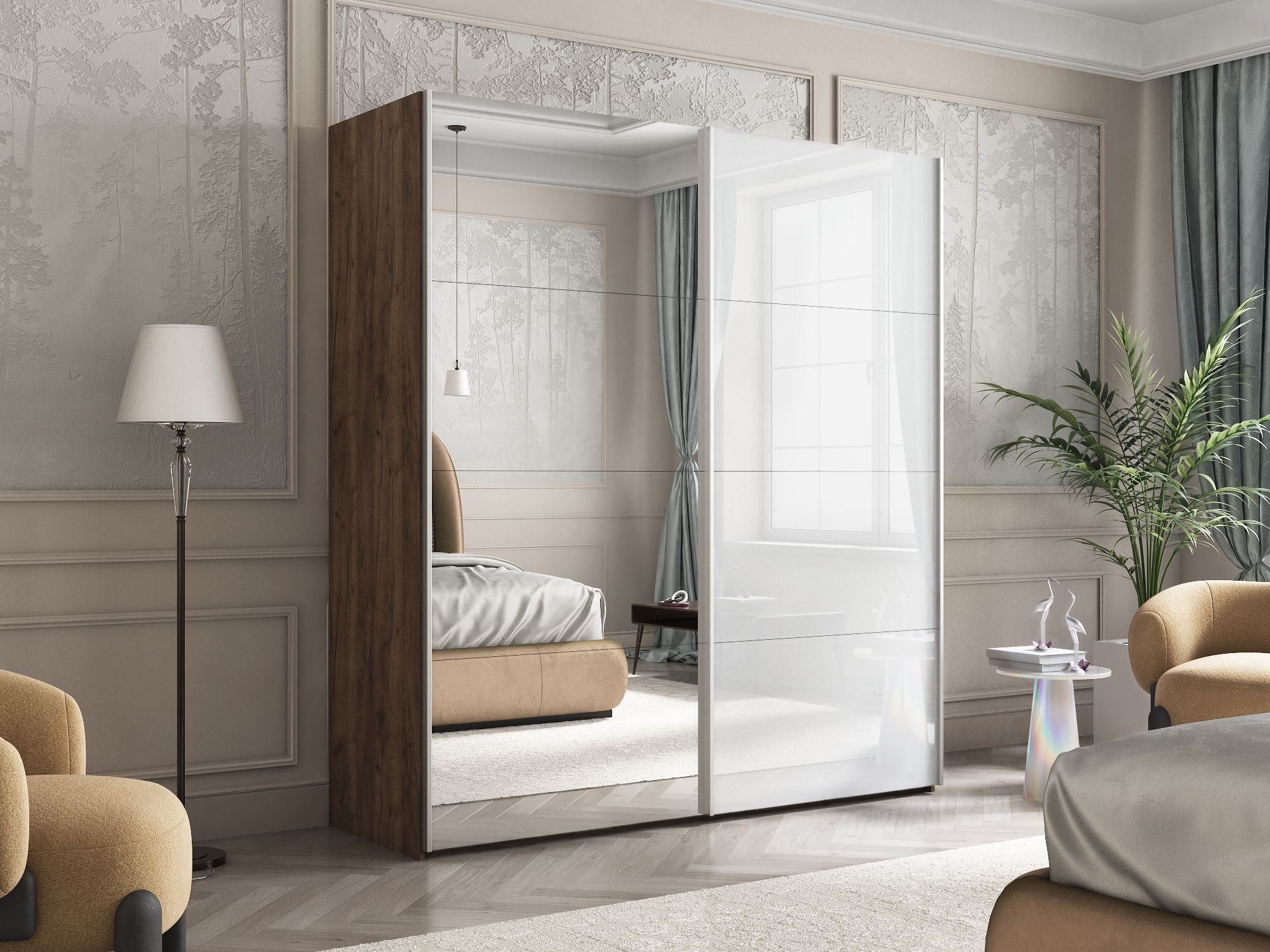Шкаф Эста дуо Стекло белое/зеркало 2400 х 2000 х 660 (Дуб/крафт/табак)