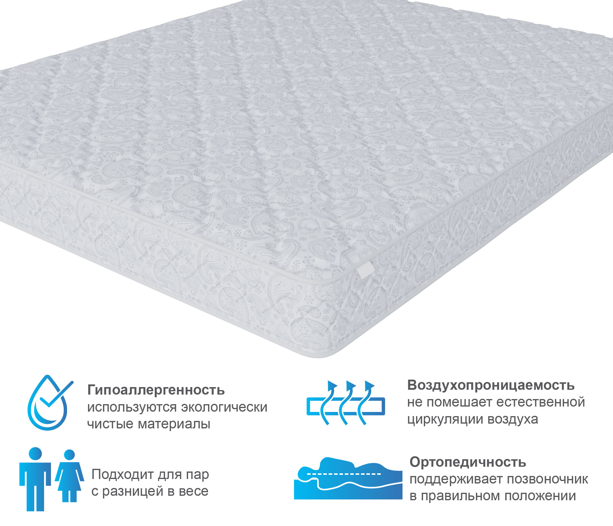 Подходит для кроватей с подъемным механизмом, отличный выбор для людей с весом выше среднего. Это жесткий беспружинный матрас, в состав которого входят как искусственные, так и натуральные материалы. В качестве наполнителя матраса используются 5 слоев латексированной кокосовой койры. Это натуральный материал на основе кокосового волокна, пропитанного натуральным латексом, а также листы ППУ. Оба материала жесткие, упругие и очень долговечные. Рекомендовано использование вместе с защитным чехлом Aquastop.Подходит для кроватей с подъемным механизмом.