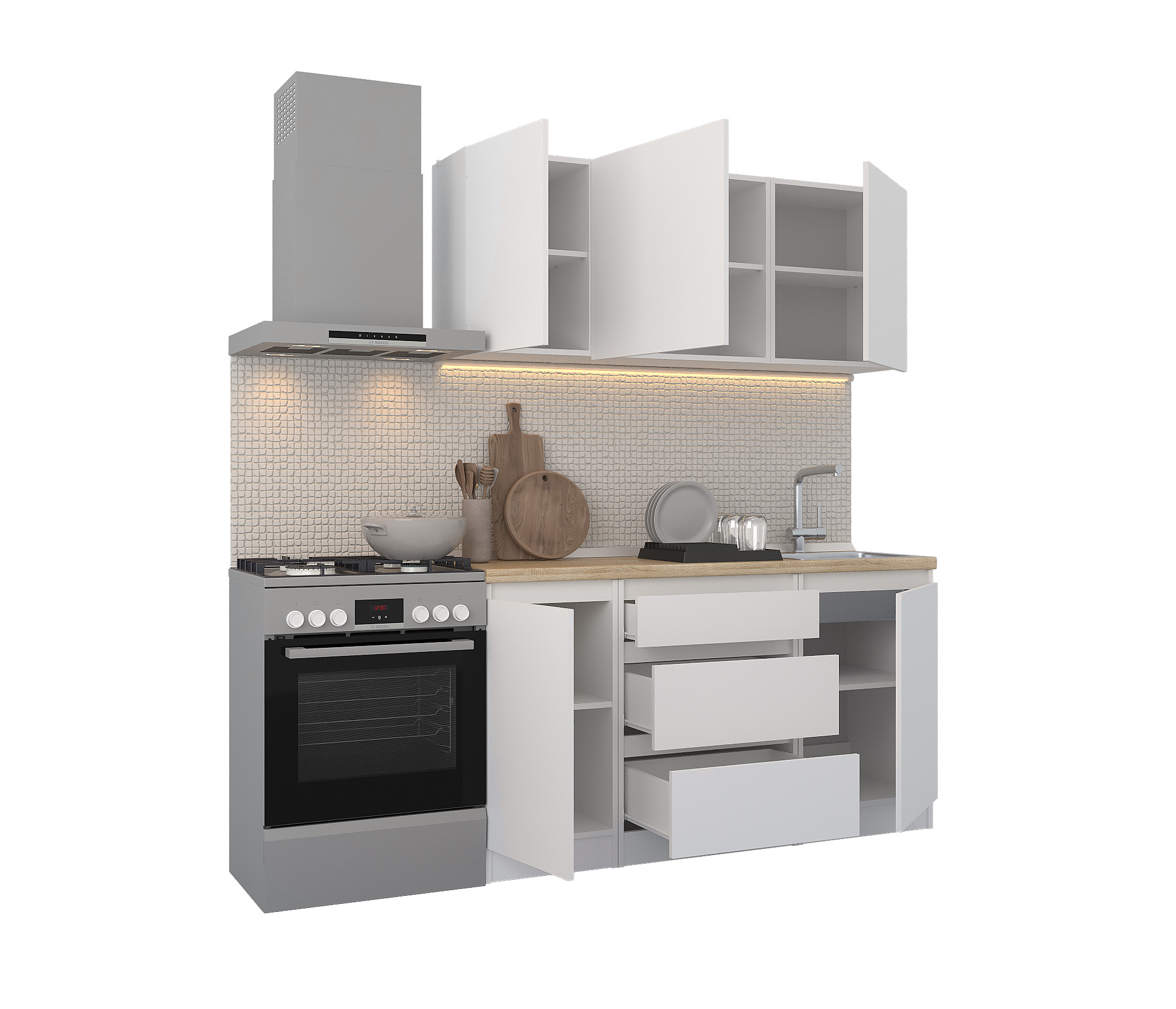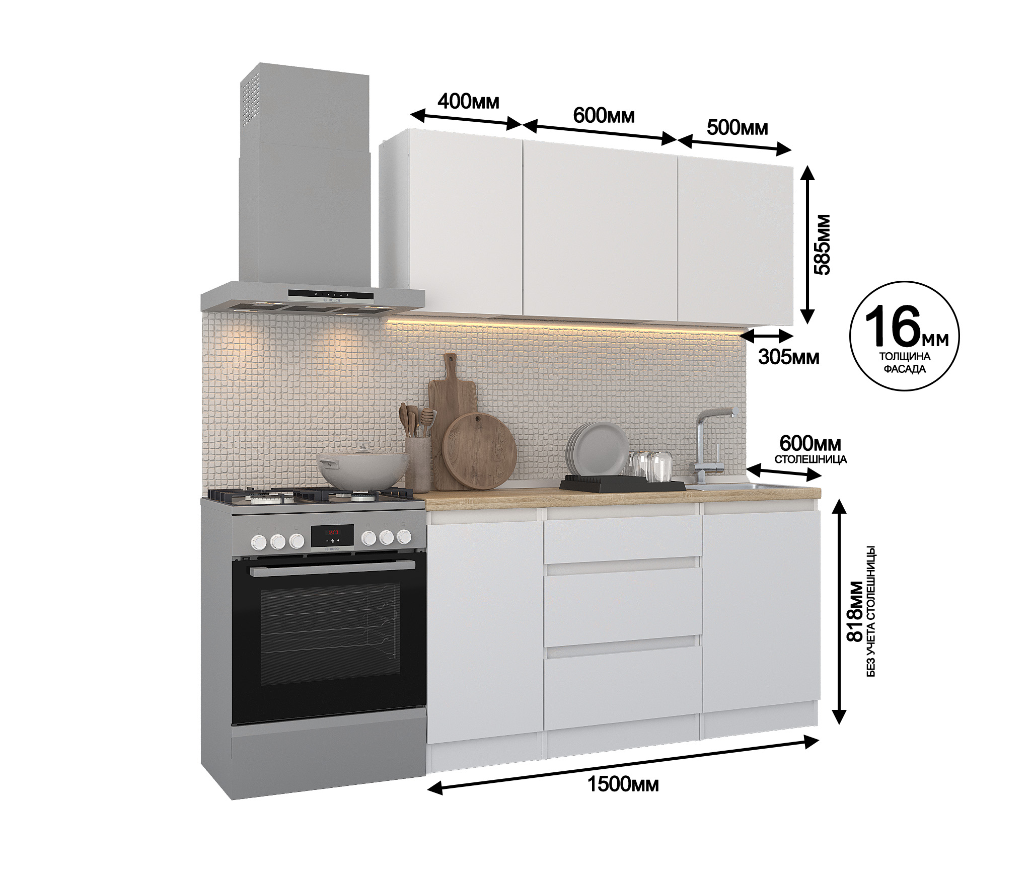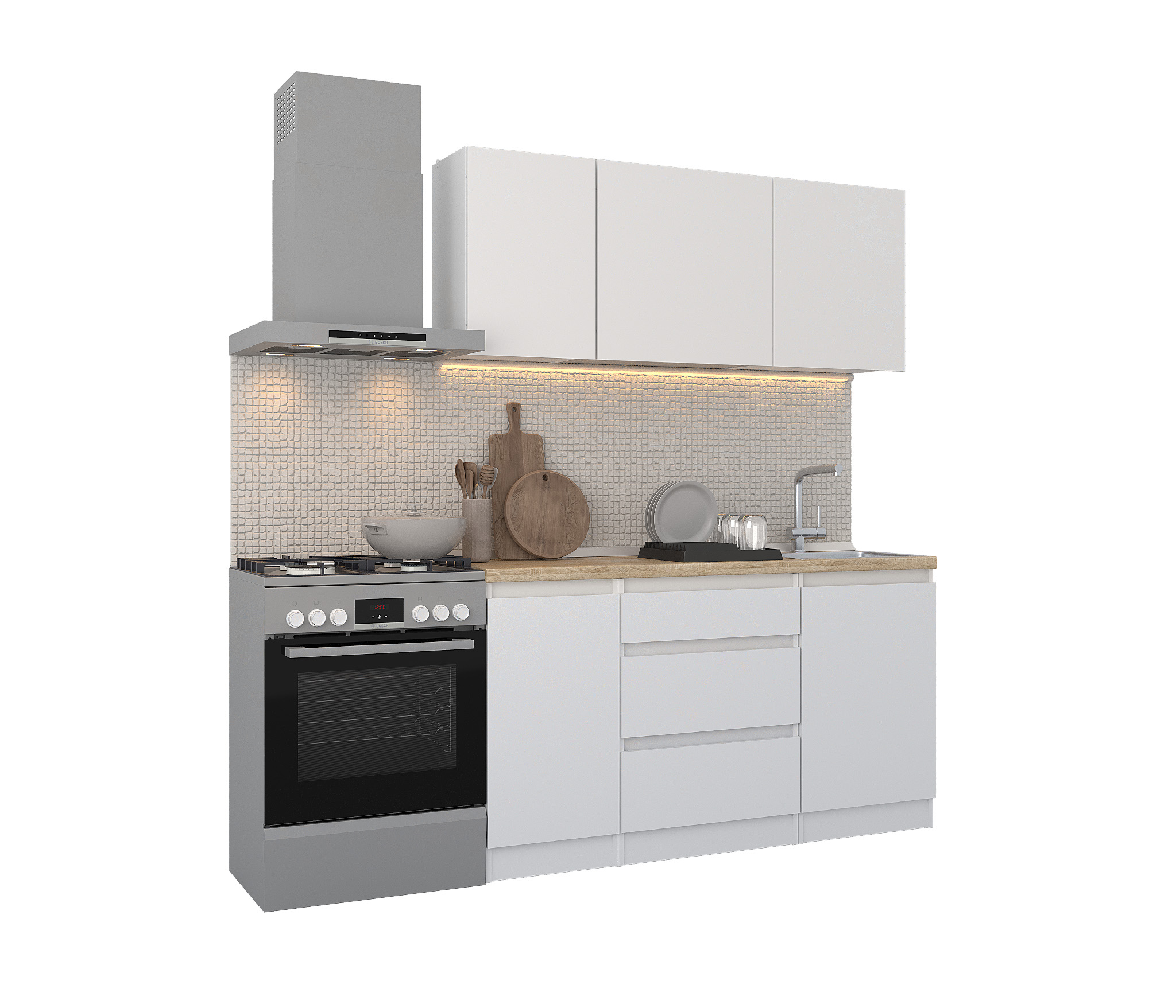 Кухня Леон сочетает в себе функциональность, стиль и доступность, и является прекрасным выбором для тех, кто ищет компактное и удобное решение для своей кухни. Кухонный гарнитур Леон идеально подходит для помещений с ограниченным пространством. Корпус и фасады выполнены из белого ЛДСП. Фасады столов и шкафов не имеют лицевой фурнитуры и открываются захватом за тыльный край фасада. Леон смотрится современно, а отсутствие ручек упрощает уход за поверхностью.