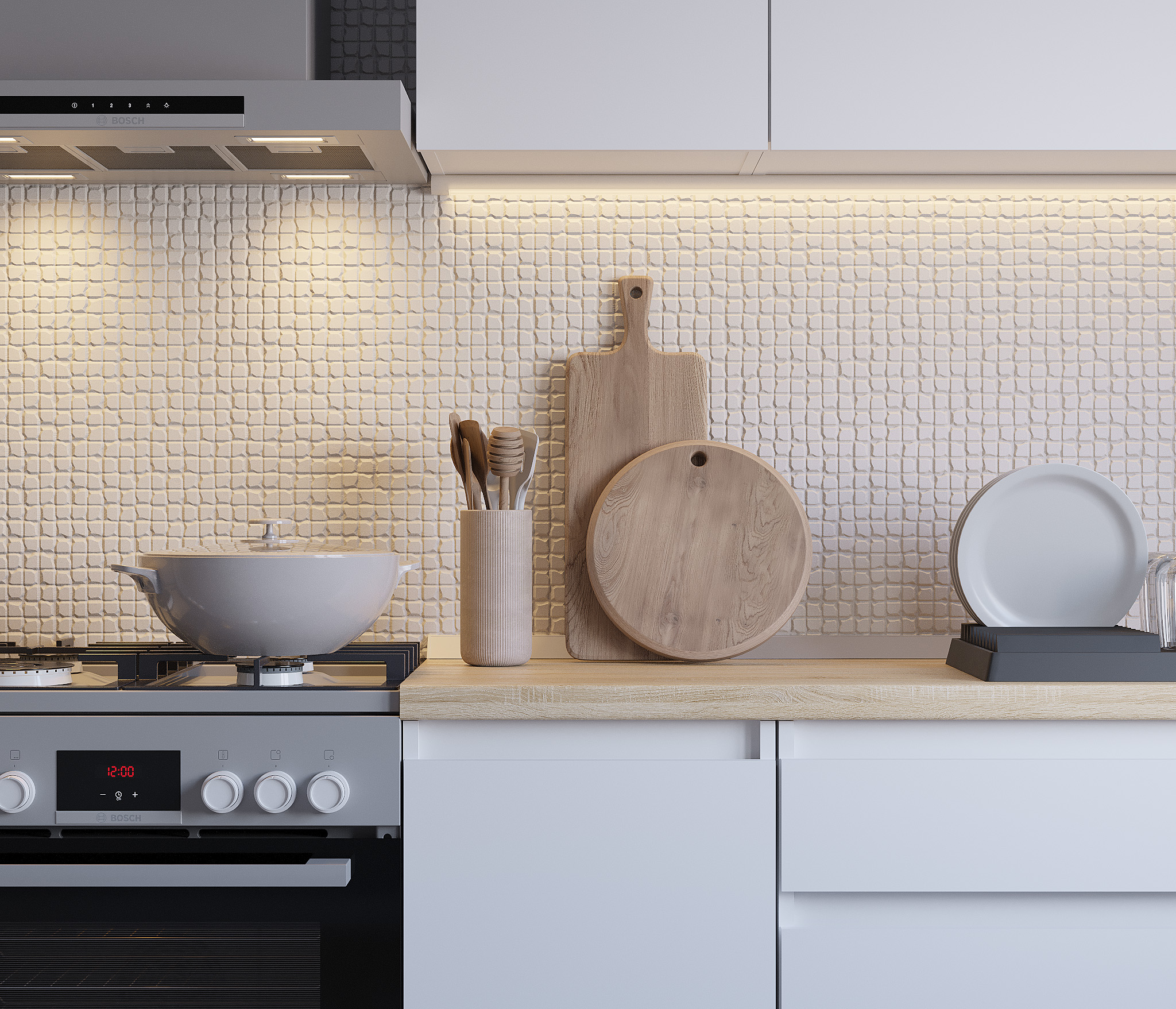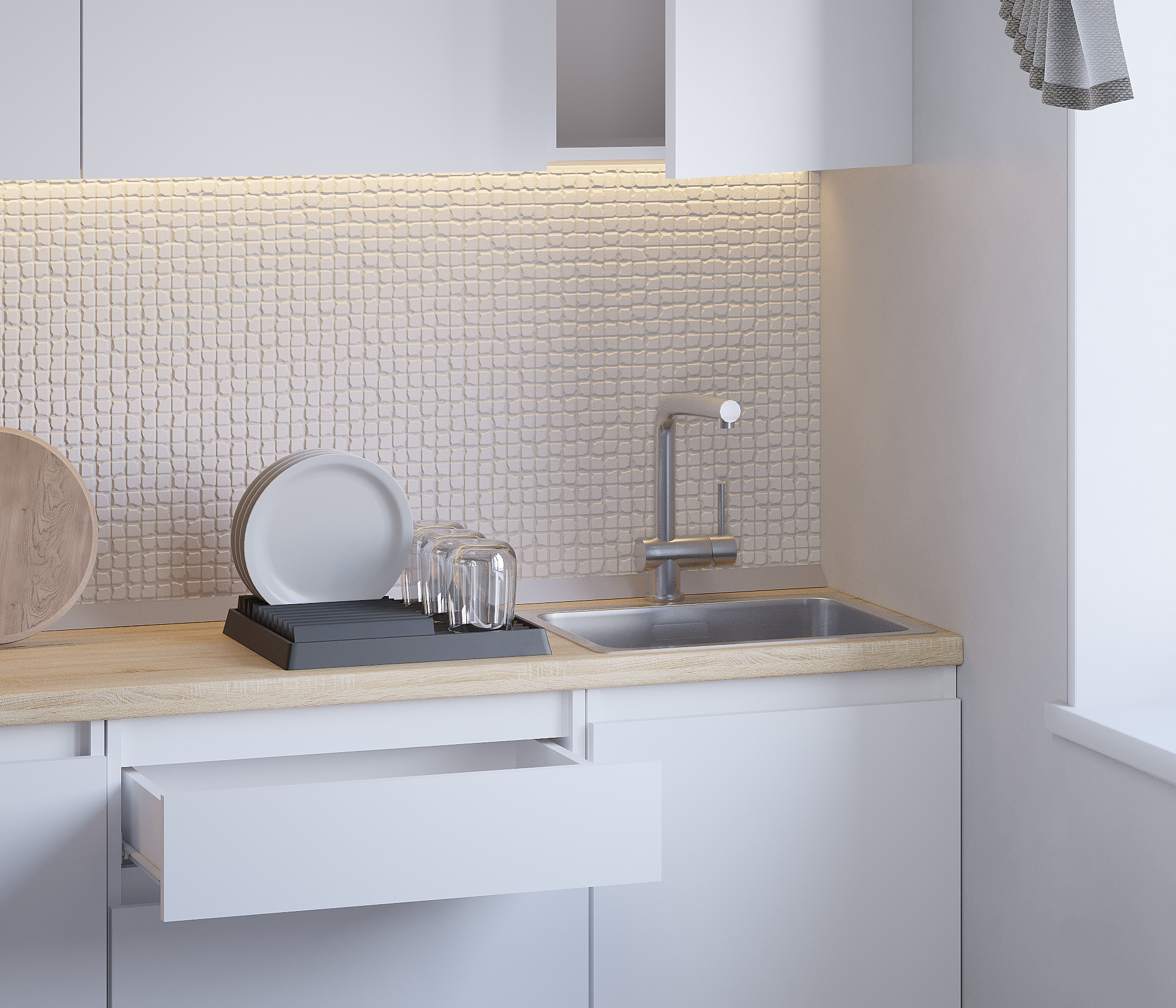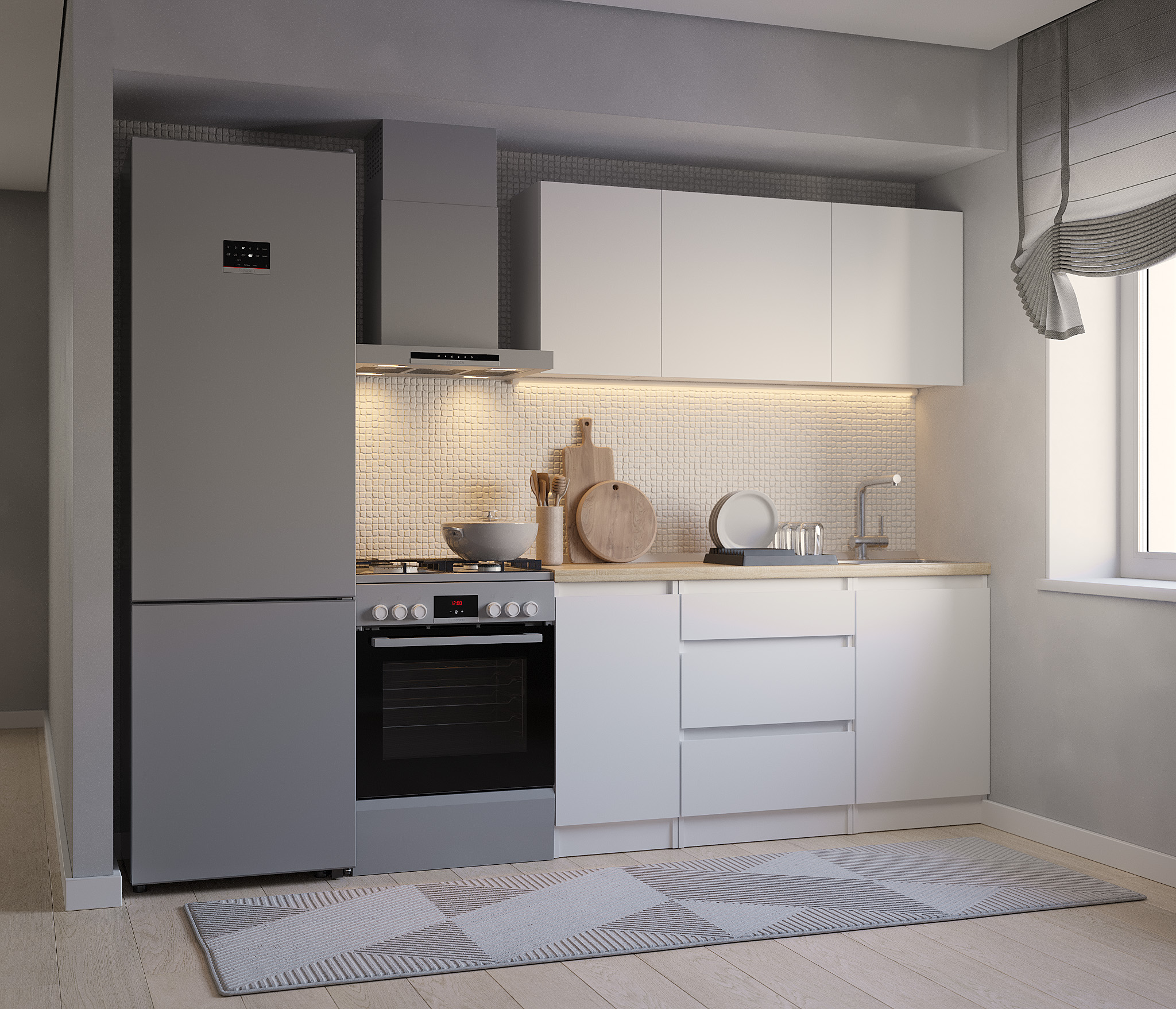 Кухня Леон сочетает в себе функциональность, стиль и доступность, и является прекрасным выбором для тех, кто ищет компактное и удобное решение для своей кухни. Кухонный гарнитур Леон идеально подходит для помещений с ограниченным пространством. Корпус и фасады выполнены из белого ЛДСП. Фасады столов и шкафов не имеют лицевой фурнитуры и открываются захватом за тыльный край фасада. Леон смотрится современно, а отсутствие ручек упрощает уход за поверхностью.