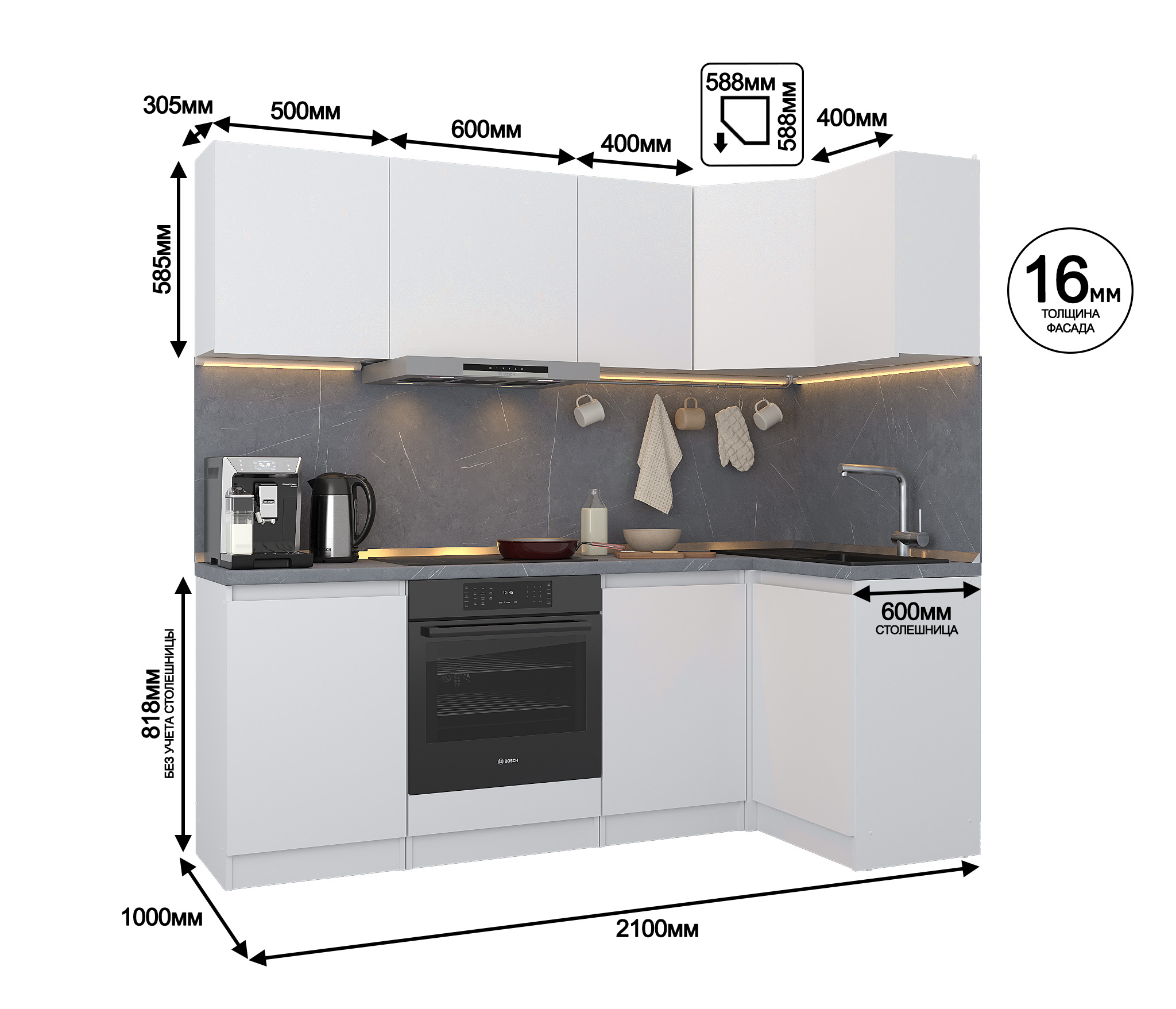 Кухонный гарнитур Леон угловой 210х100 см, белый Код 00000331076