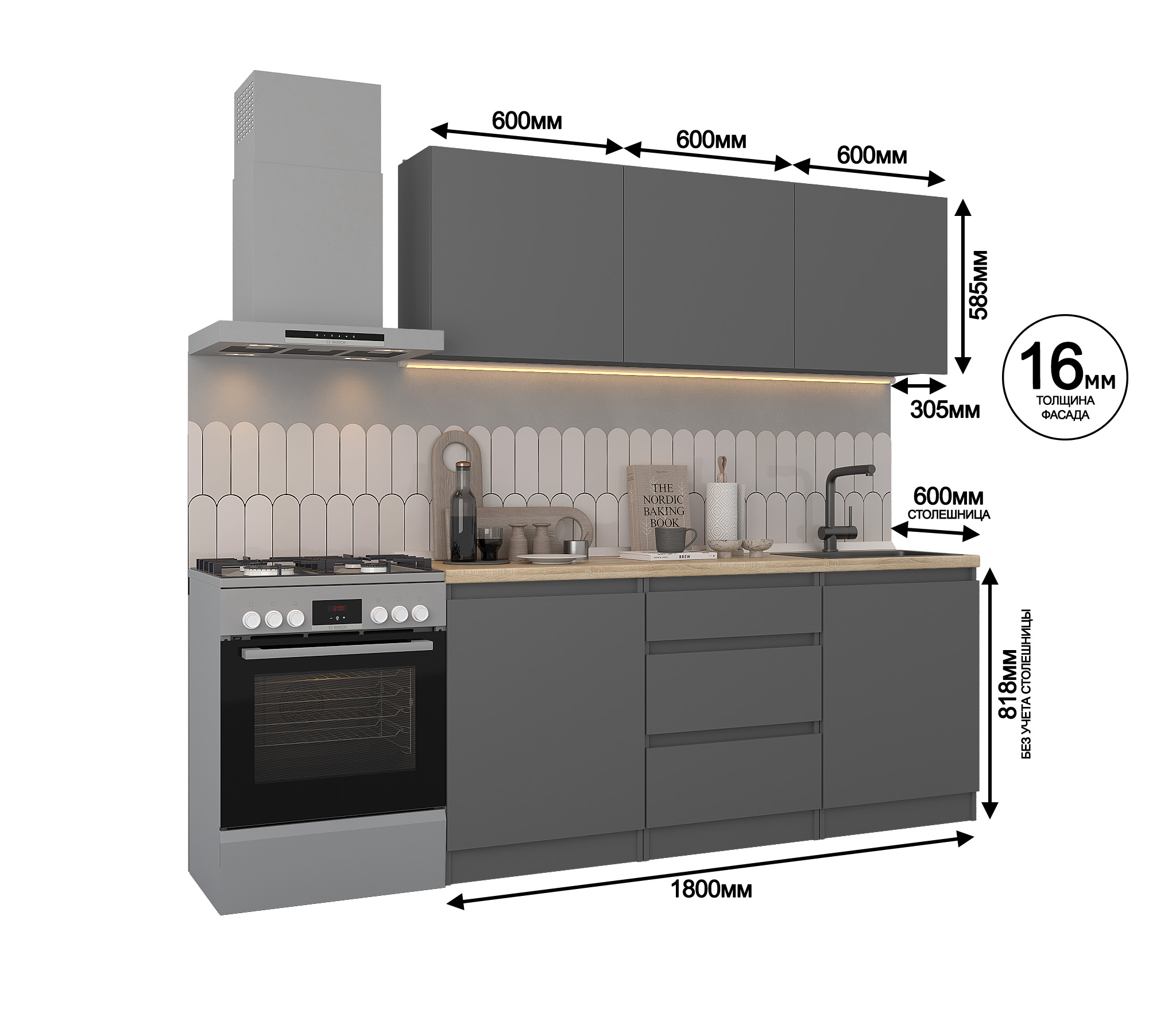 Кухонный гарнитур Леон прямой 180 см, диамант серый Код 00000334961