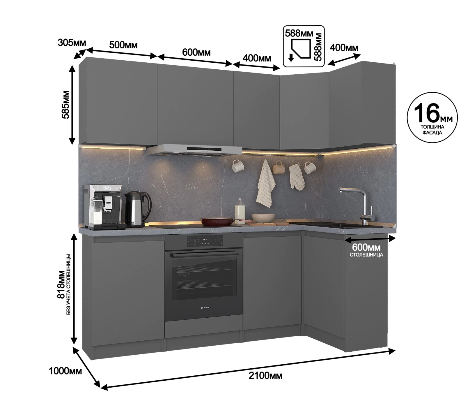 Размеры угловой кухни 2,1х1 м. она идеально подходит для помещений с ограниченным пространством.