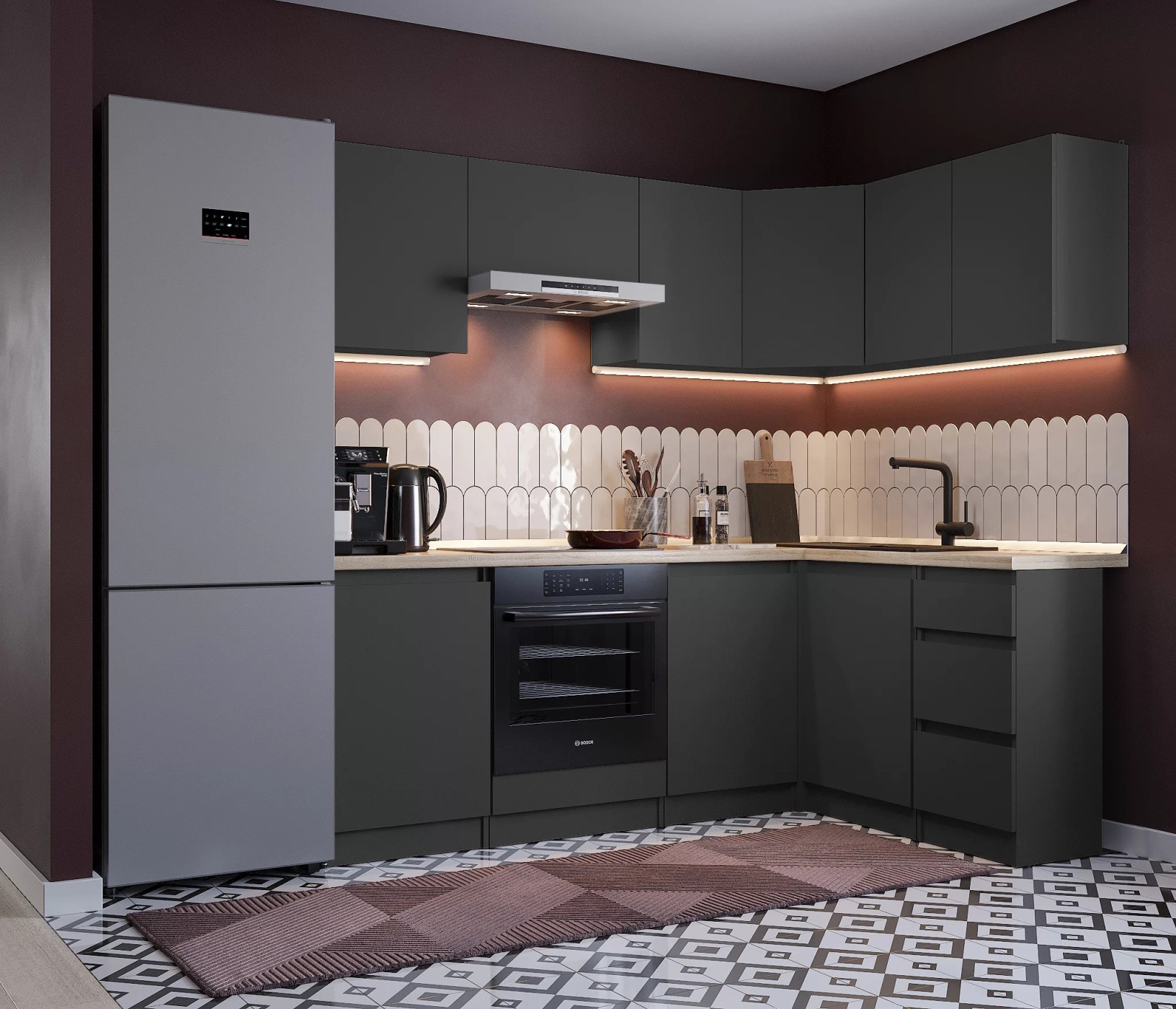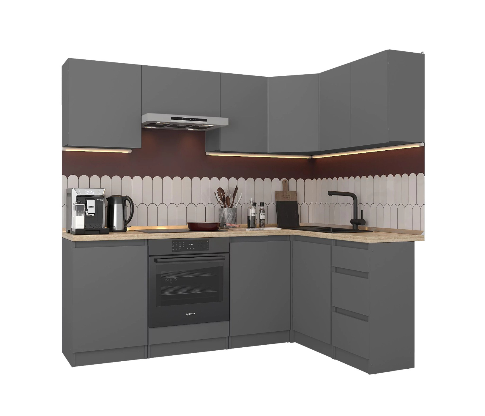 Обратите внимание, что столешница, стеновая панель, мойка и смеситель не входят в комплектацию кухни Леон и приобретаются отдельно. Это позволяет вам выбрать идеальные аксессуары и элементы для создания индивидуального дизайна вашей кухни.
