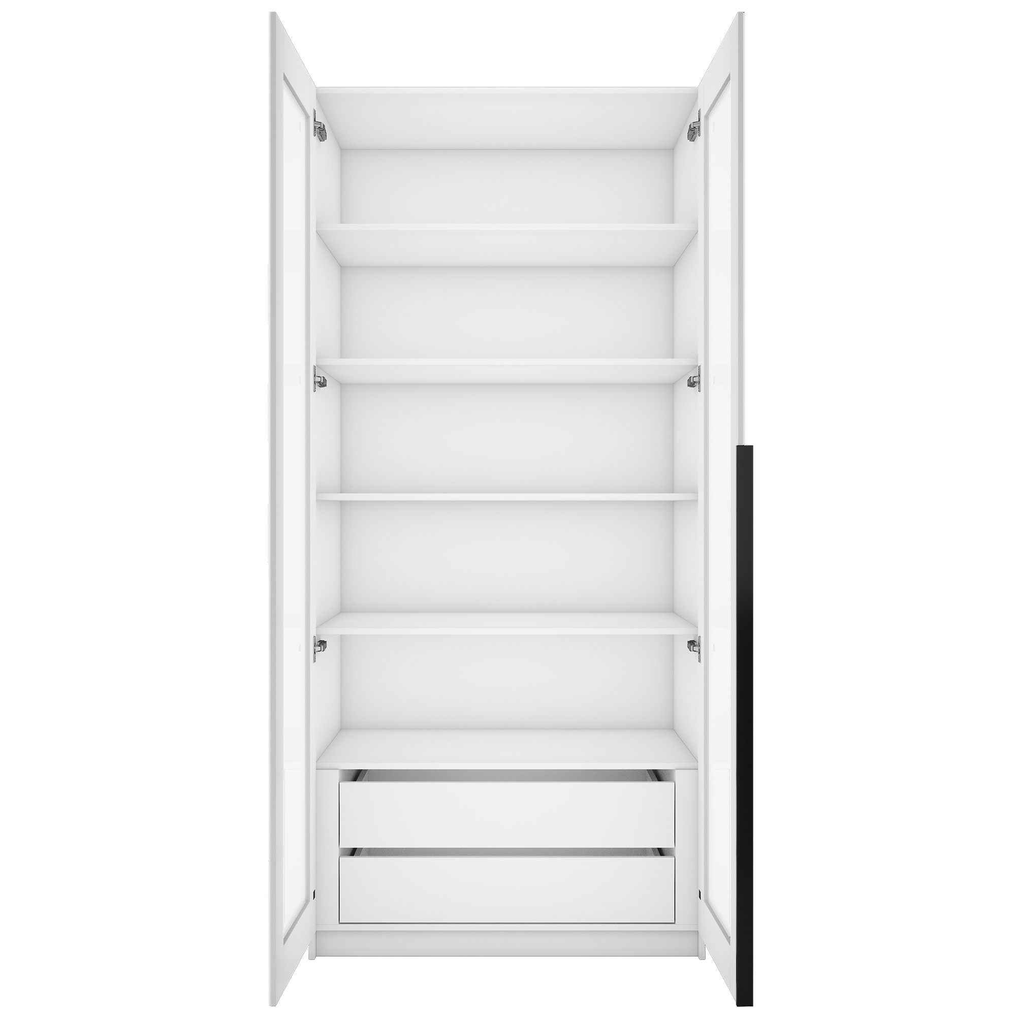 Фасады шкафа изготовлены из стекла белого цвета, оклеенного противоосколочной пленкой с внутренней рамкой из ЛДСП Белый снег.