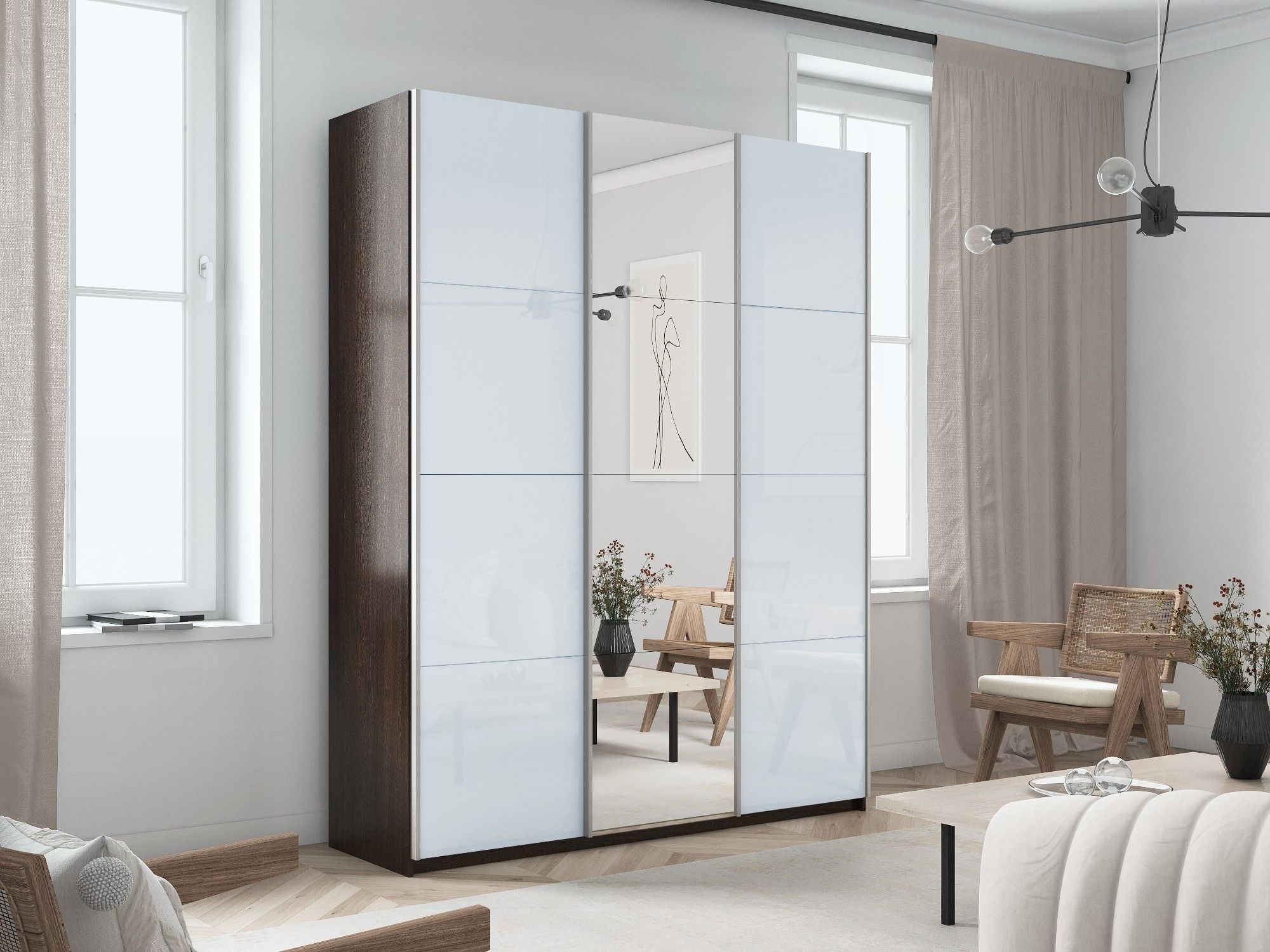 Шкаф-купе Прайм 3-х дверный Стекла белые/Зеркало/Доводчики 180х57х230 (Венге)