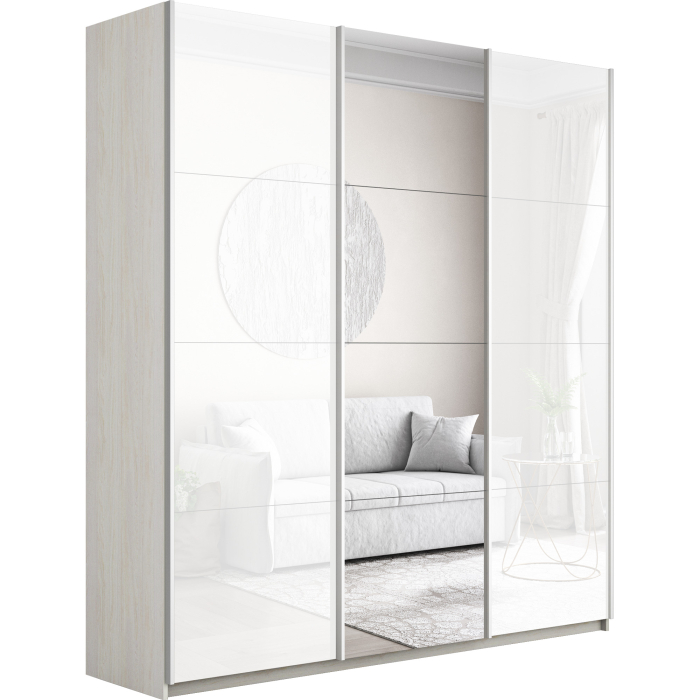Шкаф-купе Прайм 3-х дверный Стекла белые/Зеркало/Доводчики 180х57х230 (Ясень Анкор светлый)