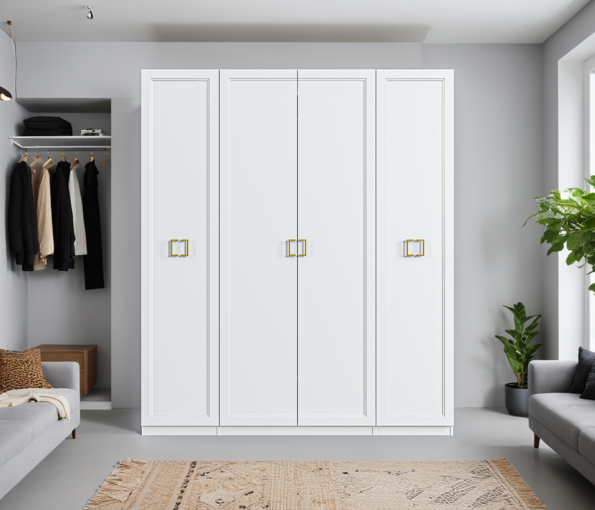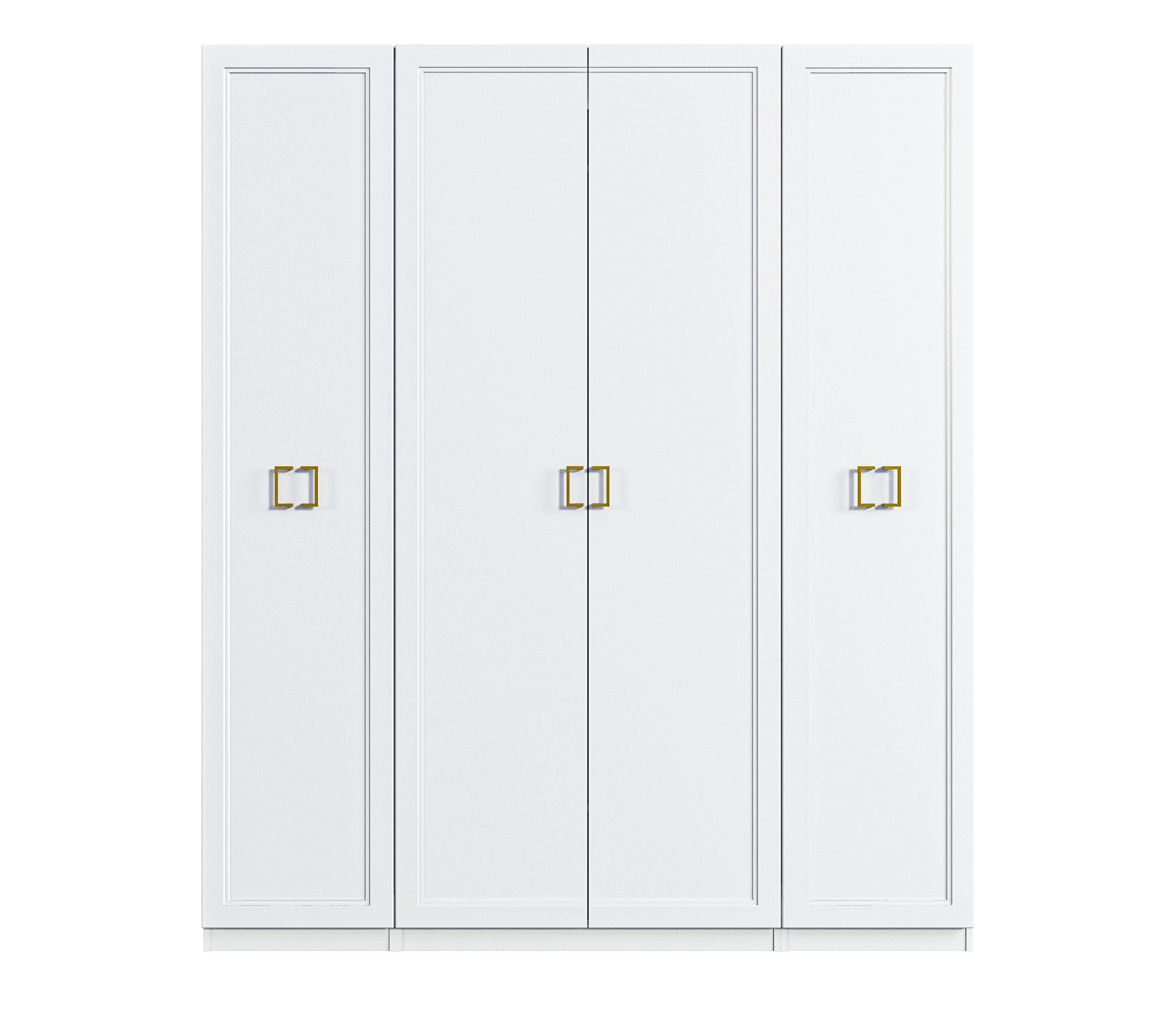 Четырехдверный шкаф Ассоль — стильное и практичное решение для вашего интерьера. Корпус из прочного ЛДСП и фасады из качественного МДФ с элегантными золотыми ручками придают шкафу изысканный вид. Внутреннее наполнение включает полки, ящики и штангу для одежды, обеспечивая удобство и порядок в хранении вещей. Идеально подходит для любой комнаты!