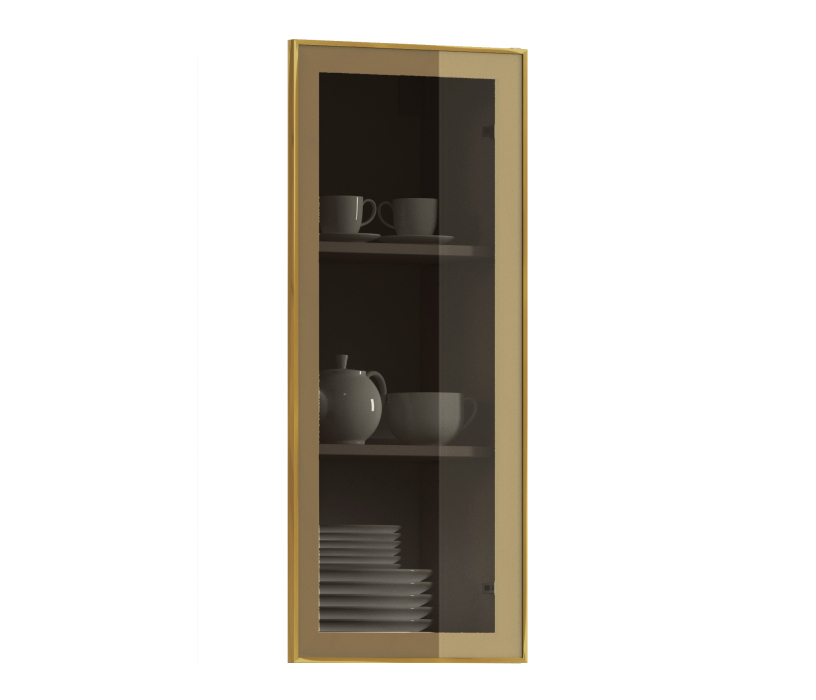 Фасад кухни выполнен из алюминиевой рамки золотого цвета, которая придаёт интерьеру элегантность и современный стиль. Бронзовое стекло добавляет нотку роскоши и глубины, создавая эффектный контраст с рамкой.