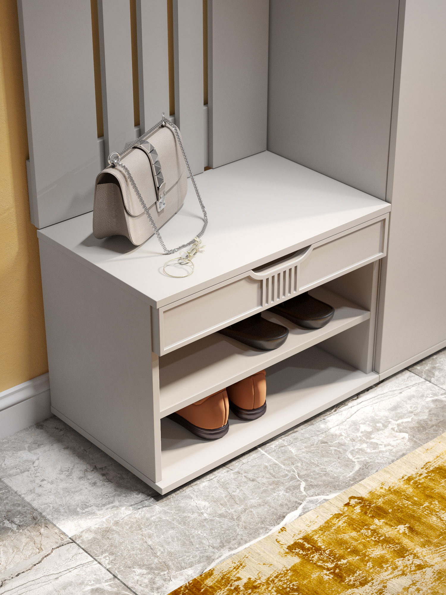 Тумба для обуви Эмилия ЭЛ-44 – компактная модель для комфортного переобувания в прихожую. Лаконичное изделие оборудовано двумя полками для обуви и сиденьем, под которым находится удобный ящик для хранения чистящих средств, щеток или зонта. Высота опоры 20 мм.