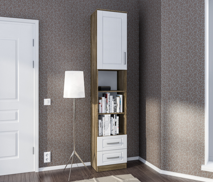 При скромных габаритных размерах – ширина 44 см, высота 221 см и глубина 35 см, пенал довольно вместительный. Визуально его можно разделить на три отделения. За дверцей находятся три вместительных полки, две открытые полки расположены над двумя большими выдвижными ящиками. Книги, документы, сувениры и множество других нужных или памятных вещей можно удобно разместить в пенале Илона СБ-2631. Отделка пенала – комбинированная. Корпус выполнен из КДСП в цвете «Дуб Сонома Трюфель». А фасадные поверхности – из МДФ в цвете «Сандал Белый». Пенал Илона может быть автономным предметом мебели, а может быть составной частью гарнитура.
