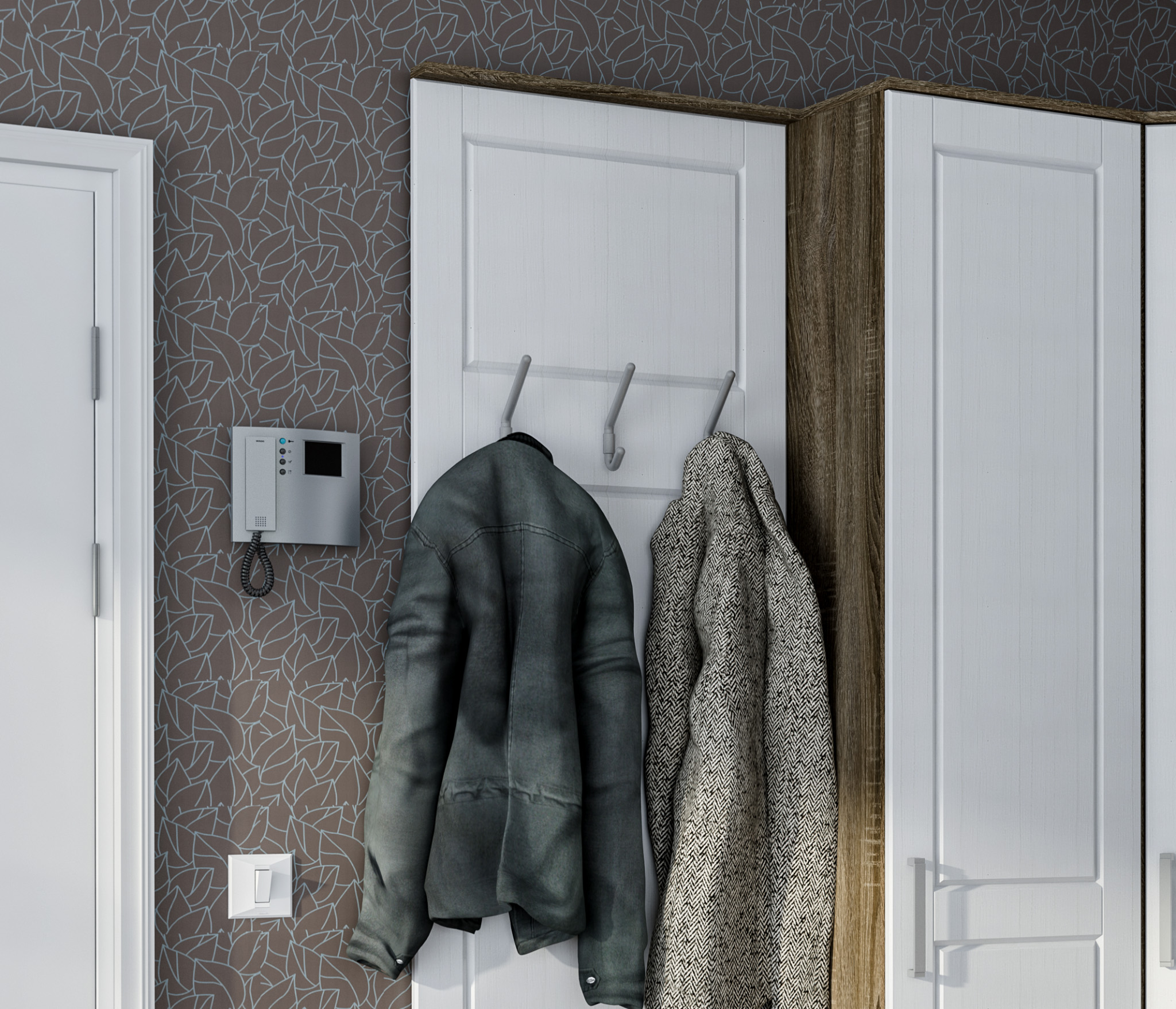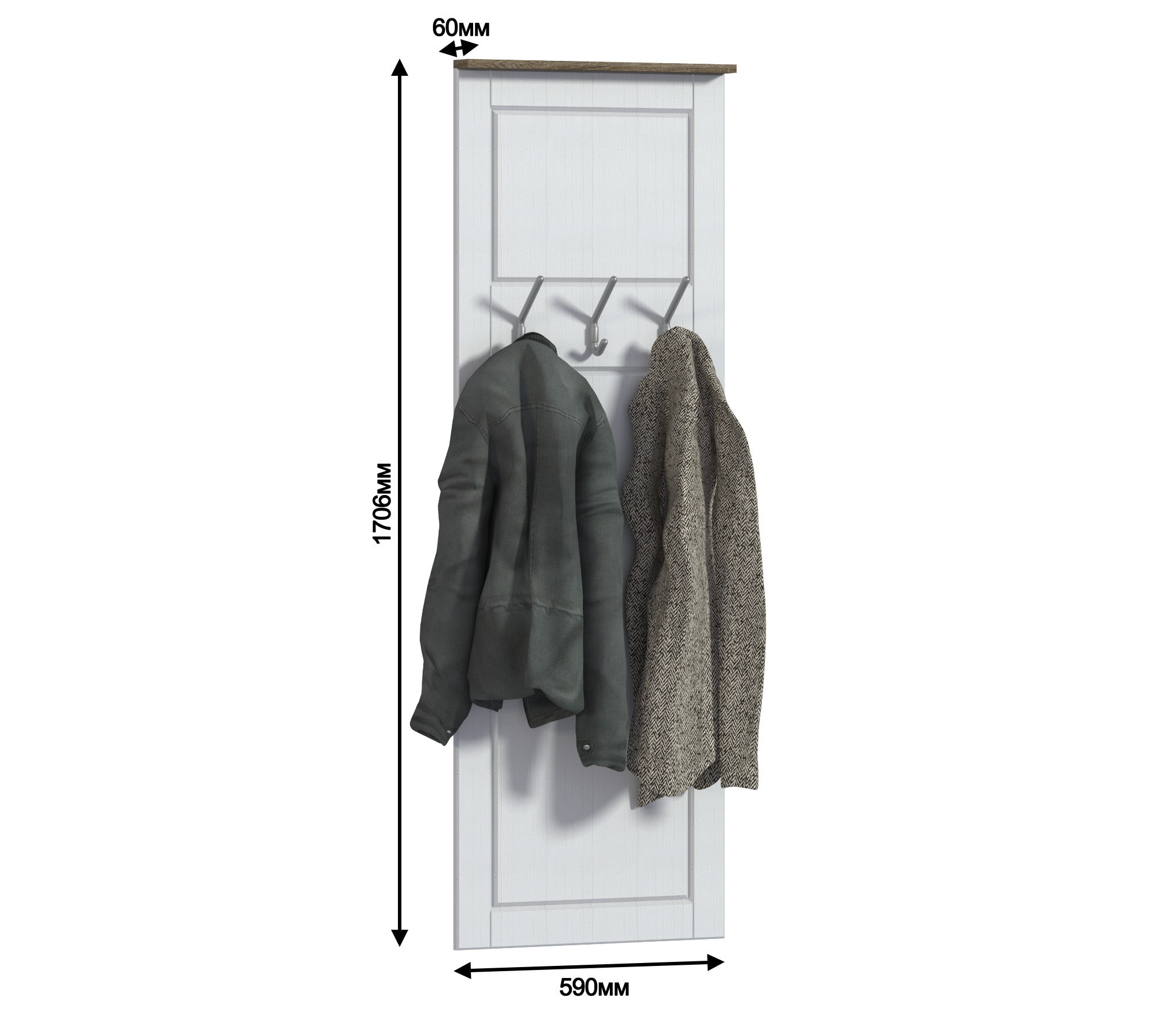 Настенная вешалка Илона СБ-2634 – элемент модульной коллекции Илона, который идеально подойдет для небольшой прихожей. Габаритные размеры – ширина 59 см, высота 169 см и глубина 6 см. Вешалка производится из современных экологичных материалов ДСП и МДФ. Оформление в оттенке «Белый сандал». Небольшая полка, расположенная сверху, оформлена в оттенке «Дуб Сонома трюфель».