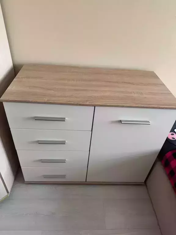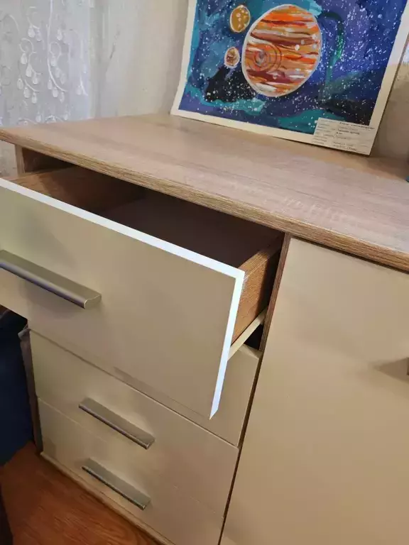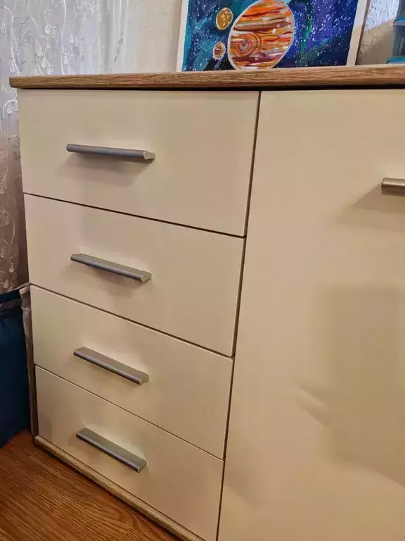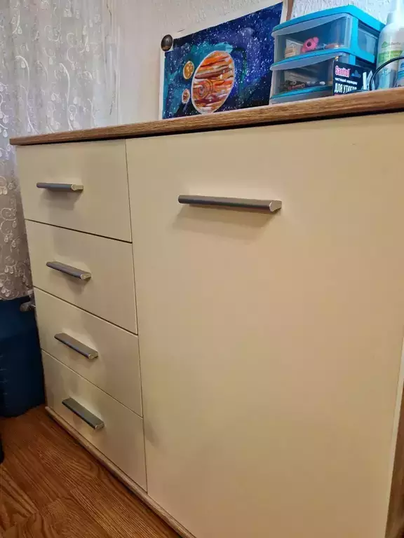 Комод выполнен в лаконичном дизайне, светлое покрытие фасадов позволяет смотреться этому предмету мебели стильно и не громоздко.