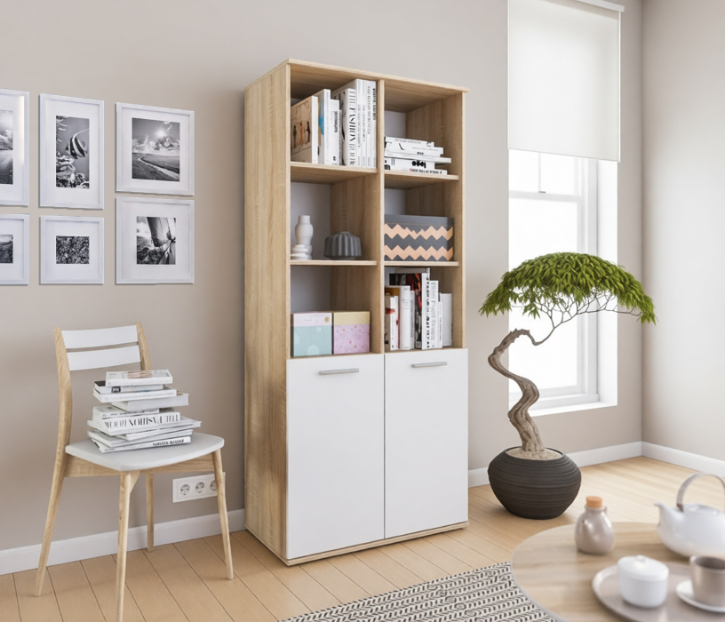 Габаритные размеры – ширина 78 см, высота 176 см и глубина 44 см. Конструктивно стеллаж состоит из нескольких вместительных открытых полок и из отделения с непрозрачными дверцами.Модель производится из современного материала КДСП. Отделка комбинированная – корпус в цвете «Дуб Сонома», фасадные поверхности белые.
