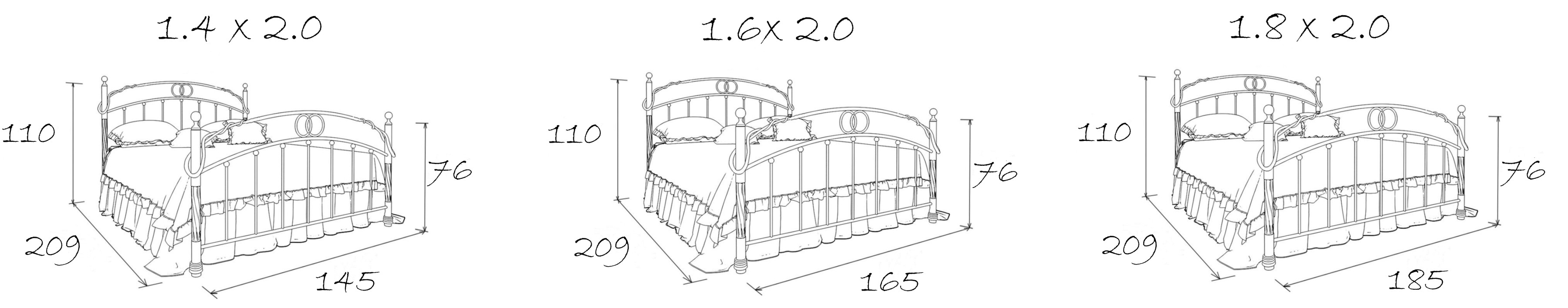 Размеры спального места (ДхШ) 2000х1800, высота изножья 760 мм, максимальная нагрузка на 1 спальное место - 150 кг.