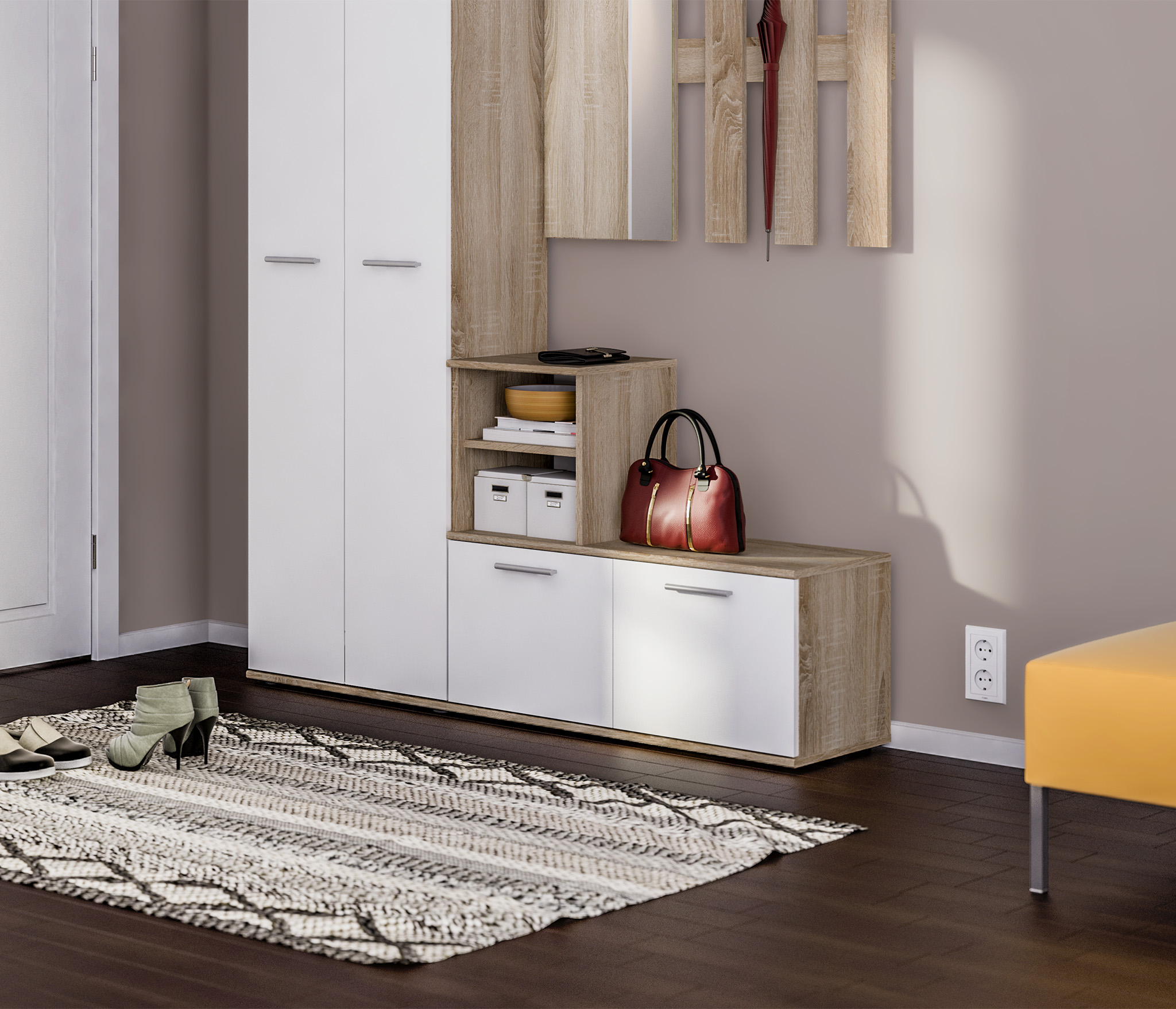 Габаритные размеры – ширина 87 см, высота 76 см и глубина 35 см. В двух вместительных отделениях тумбы помещается до восьми пар обуви. Каждое отделение имеет отдельную дверцу. На двух открытых полках можно хранить различные мелочи. Тумба произведена из экологичного прочного КДСП, устойчивого к мелким механическим повреждениям. Отделка комбинированная – корпус в цвете «Дуб Сонома», фасадные поверхности чисто белые. Тумба снабжена протекторами, которые сберегут пол от царапин.