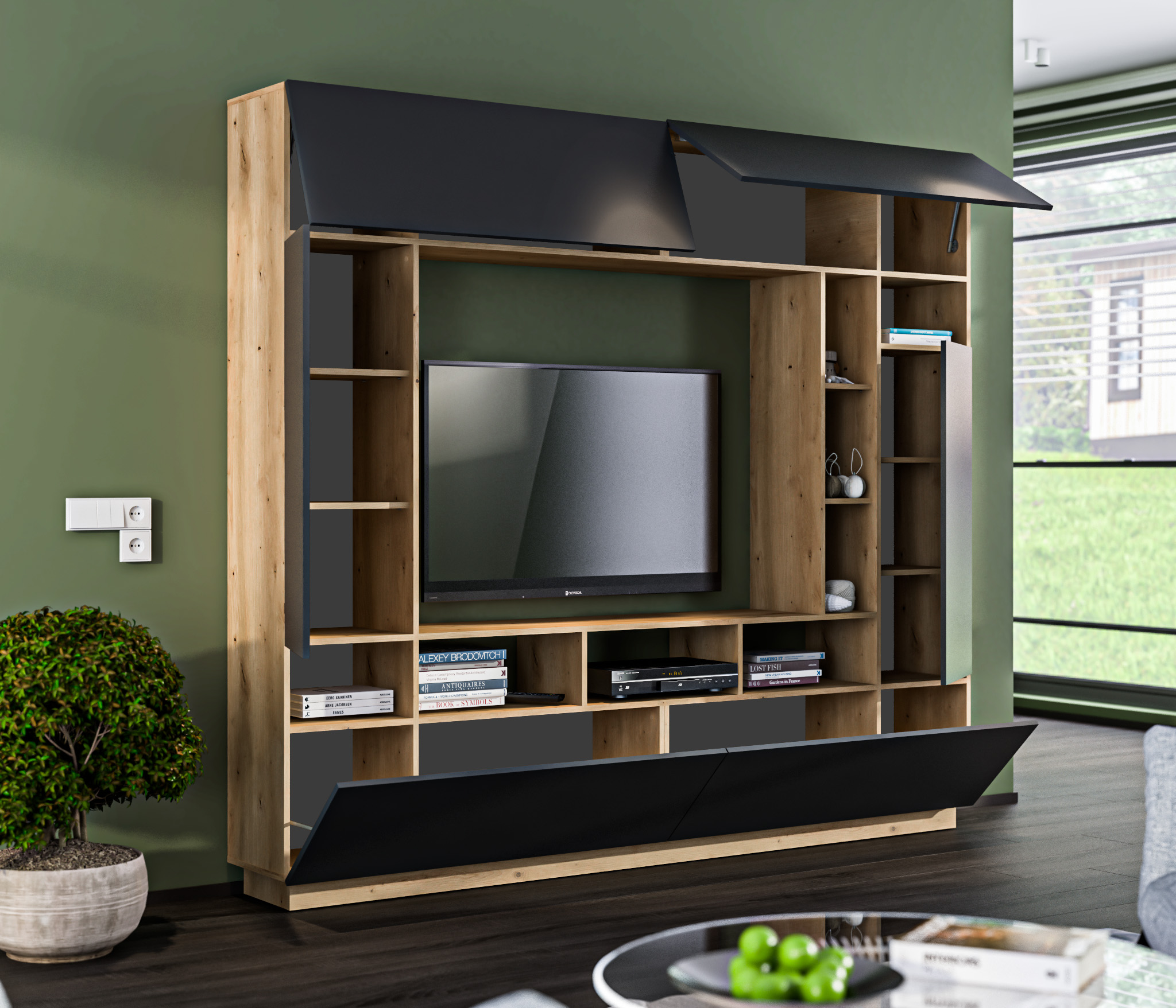 Стенка Нео СБ-2898 – практичный и стильный предмет мебели, который станет идеальным дополнением интерьера гостиной. Органично смотрится соло. Габаритные размеры – ширина 232 см, высота 206 см, глубина 34 см. В состав стенки входит: тумба под телевизор с открытыми полками для видео, аудио аппаратуры и отделениями с непрозрачными дверцами, открытая витрина для демонстрации коллекции декоративной посуды или памятных сувениров, шкафы для книг, посуды. Корпус стенки выполнен из КДСП, фасады - из МДФ в актуальном цветовом решении.
