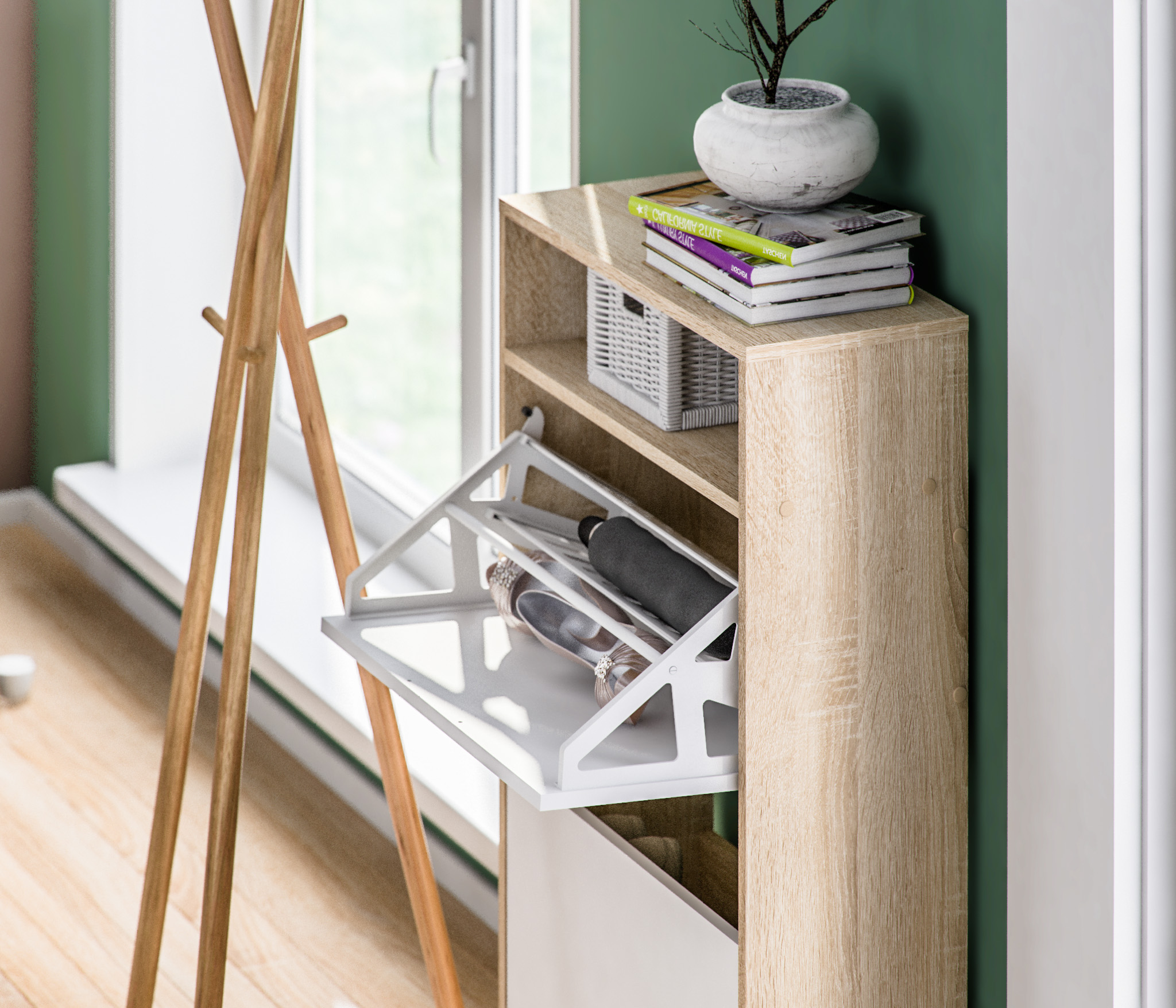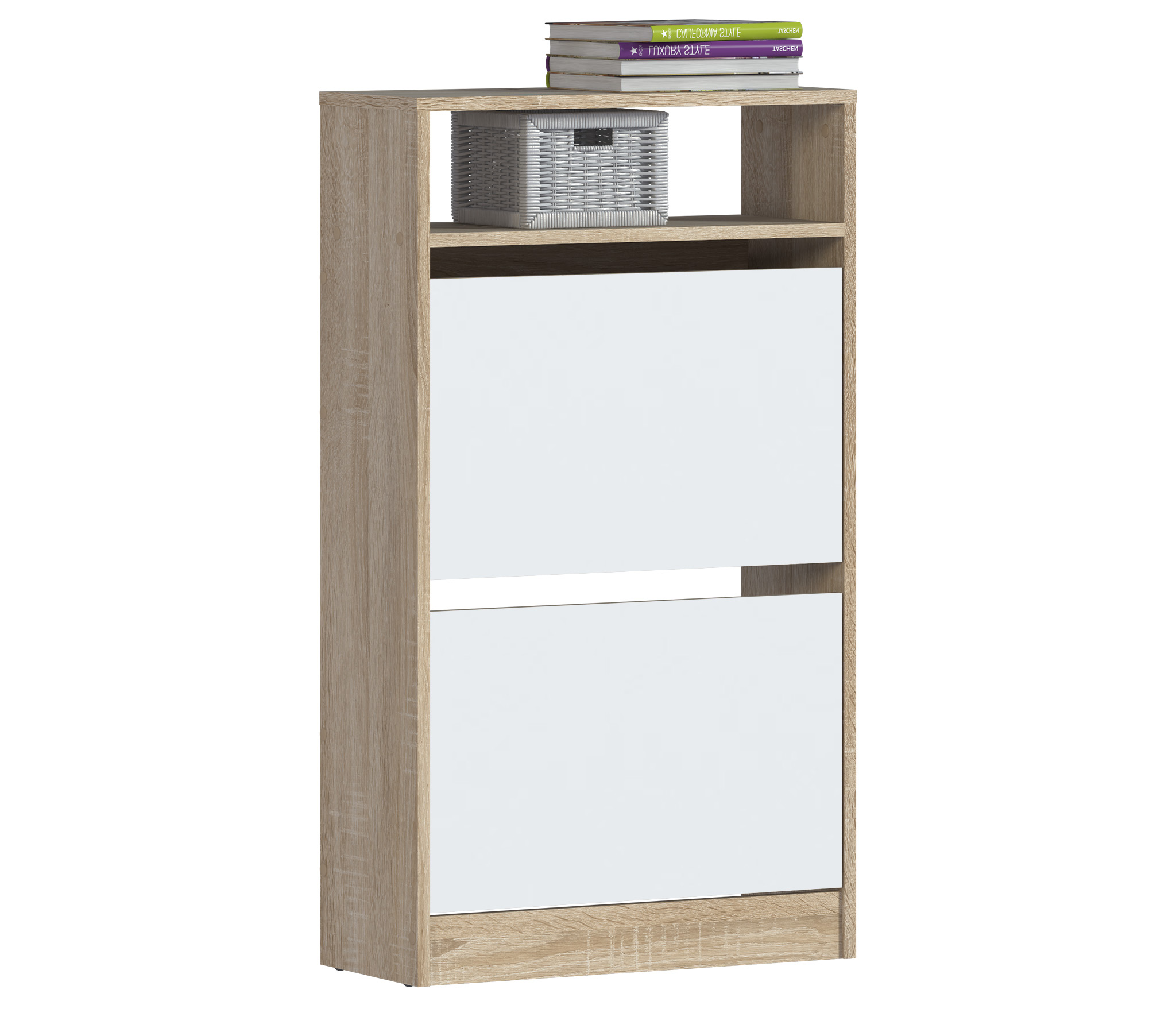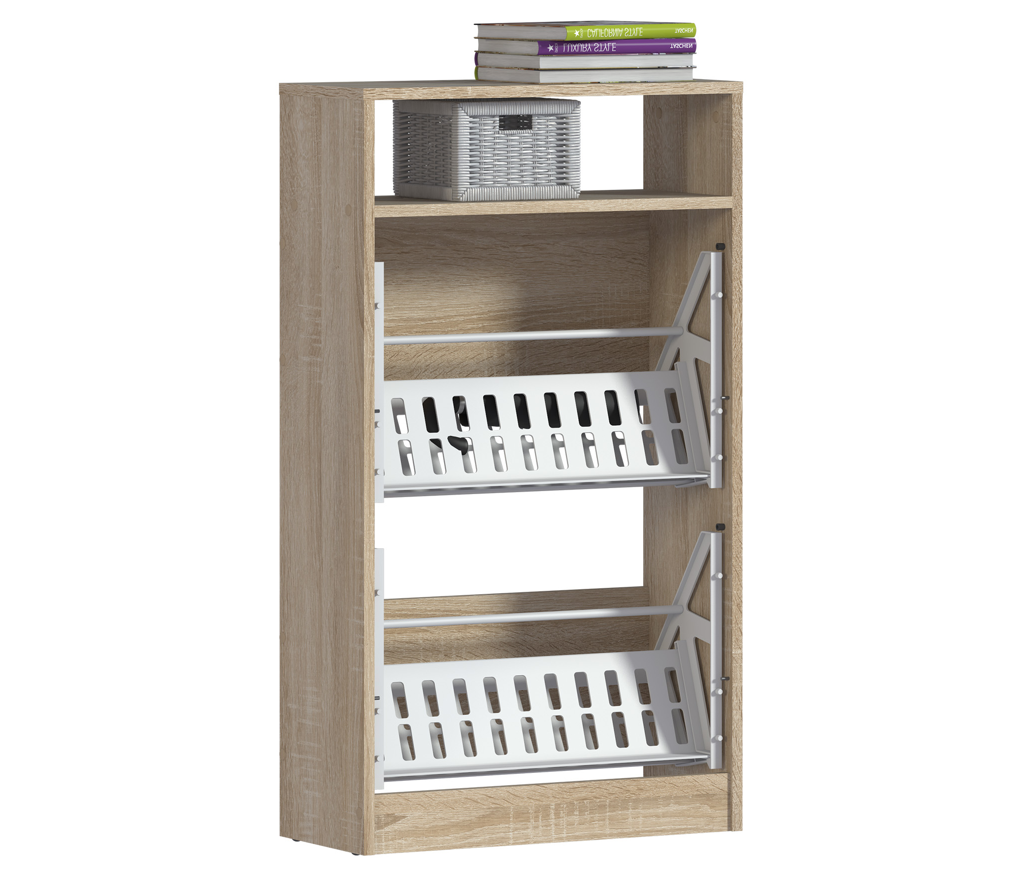 Габаритные размеры – ширина 59 см, высота 103 см и глубина 25 см. Обувница очень вместительная: имеет открытую полочку для хранения мелочей и два отделения, каждое из которых оснащено специальными стойками для хранения обуви. Отсутствие ручек и строгие геометрические формы позволяют вписать обувницу в любой интерьер.