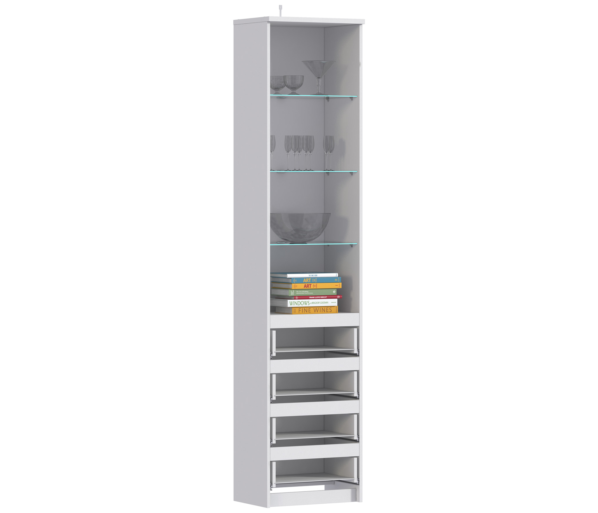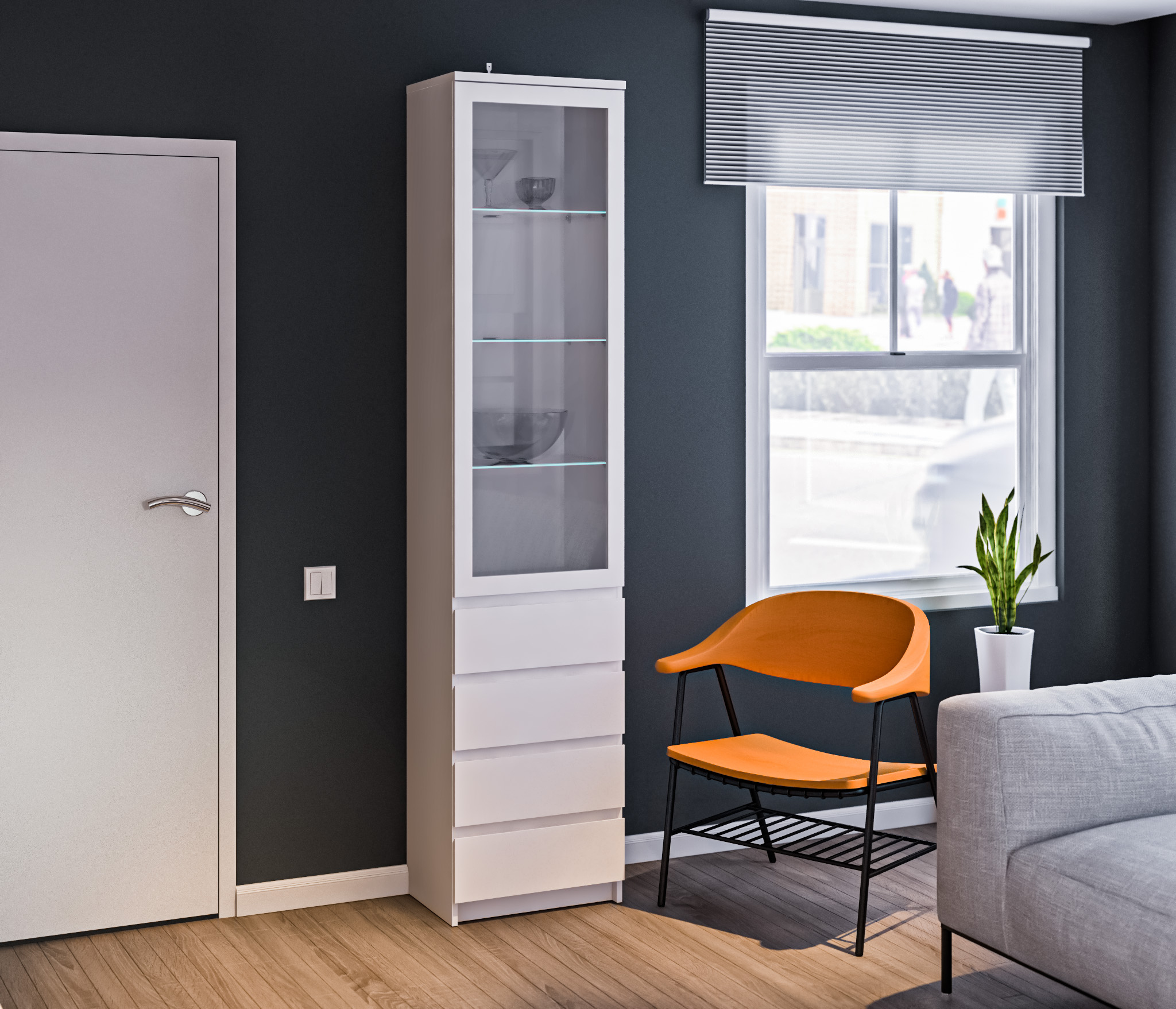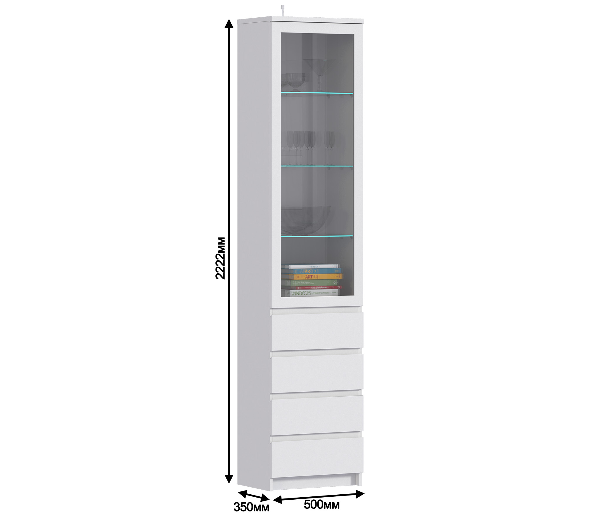 При компактных размерах – ширина 50 см, высота 222 см и глубина 35 см, это довольно вместительная витрина, которая позволит решить вопросы, связанные с хранением памятных вещей. Визуально витрина разделена на два отделения – верхнее – выставочное, находится за прозрачной дверцей и имеет четыре полки. Нижнее включает четыре вместительных выдвижных ящика.