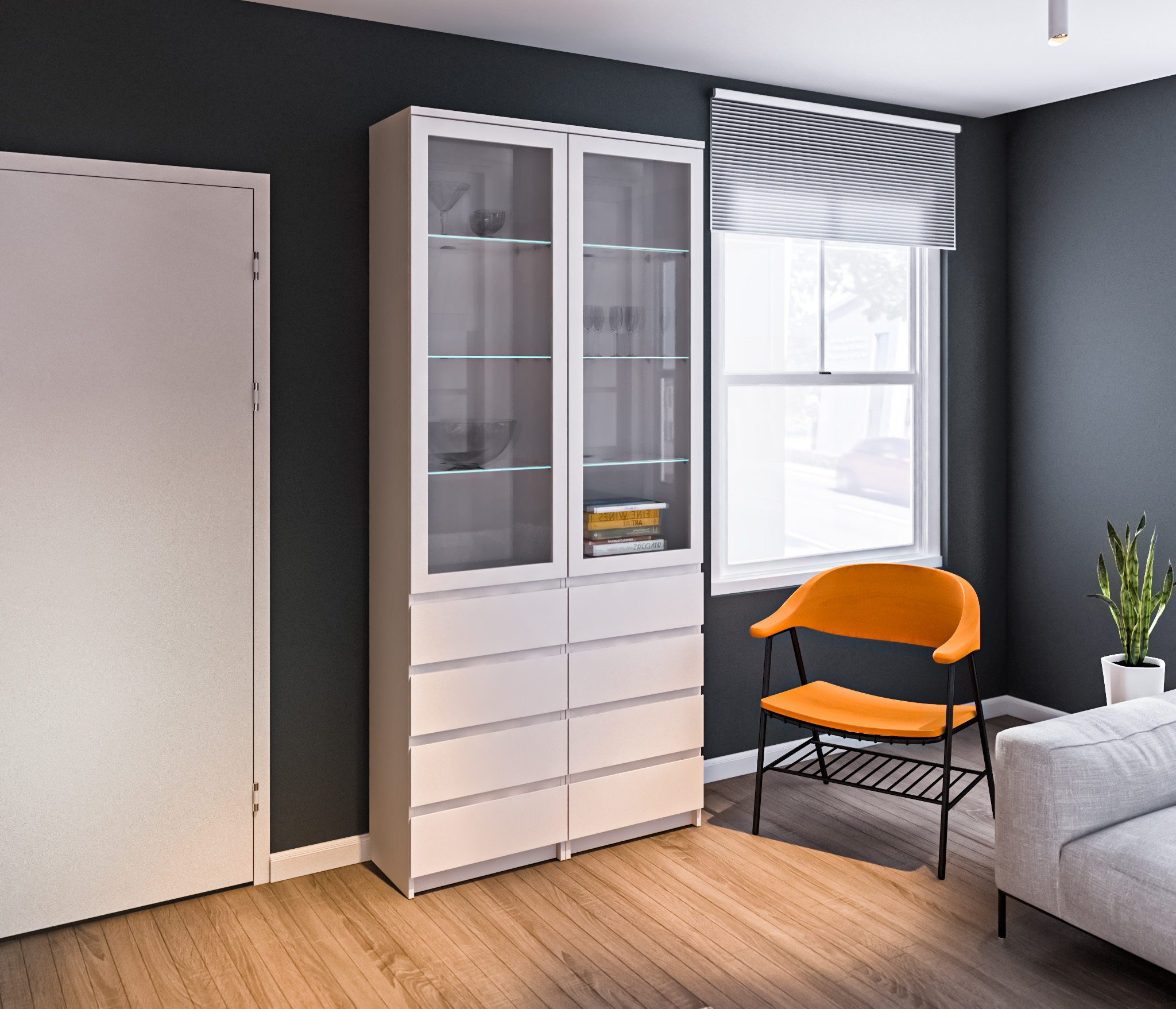 Витрина Веста СБ-2248 вполне может использоваться в интерьере соло, а также может быть дополнена элементами модульного гарнитура Веста. Минималистичный дизайн пенала-витрины позволит разместить его в помещении любого назначения – спальне, гостиной, кабинете или прихожей.
