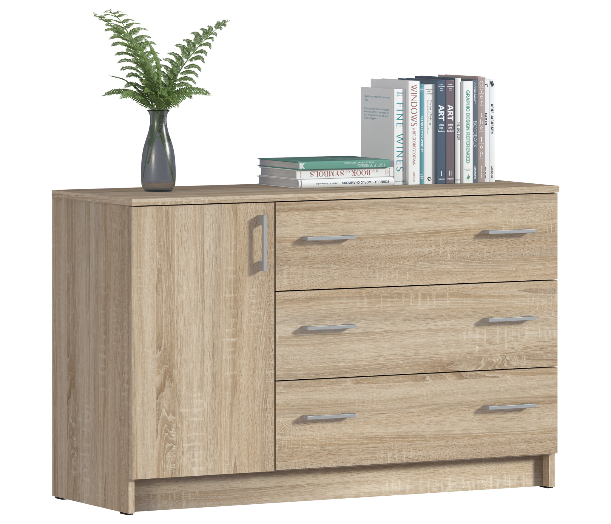 Габаритные размеры комода Терра – ширина 119 см, высота 75 см и глубина 44 см. Под одной столешницей объединены одна тумба и отделение с тремя большими выдвижными ящиками. В тумбе два больших отделения. Ящики оснащены выдвижными механизмами, рассчитанными на длительный срок эксплуатации.Комод Терра выполнен в лаконичном дизайне. Благодаря природному цвету Дуб Сонома, комод Терра смотрится легко и стильно.
