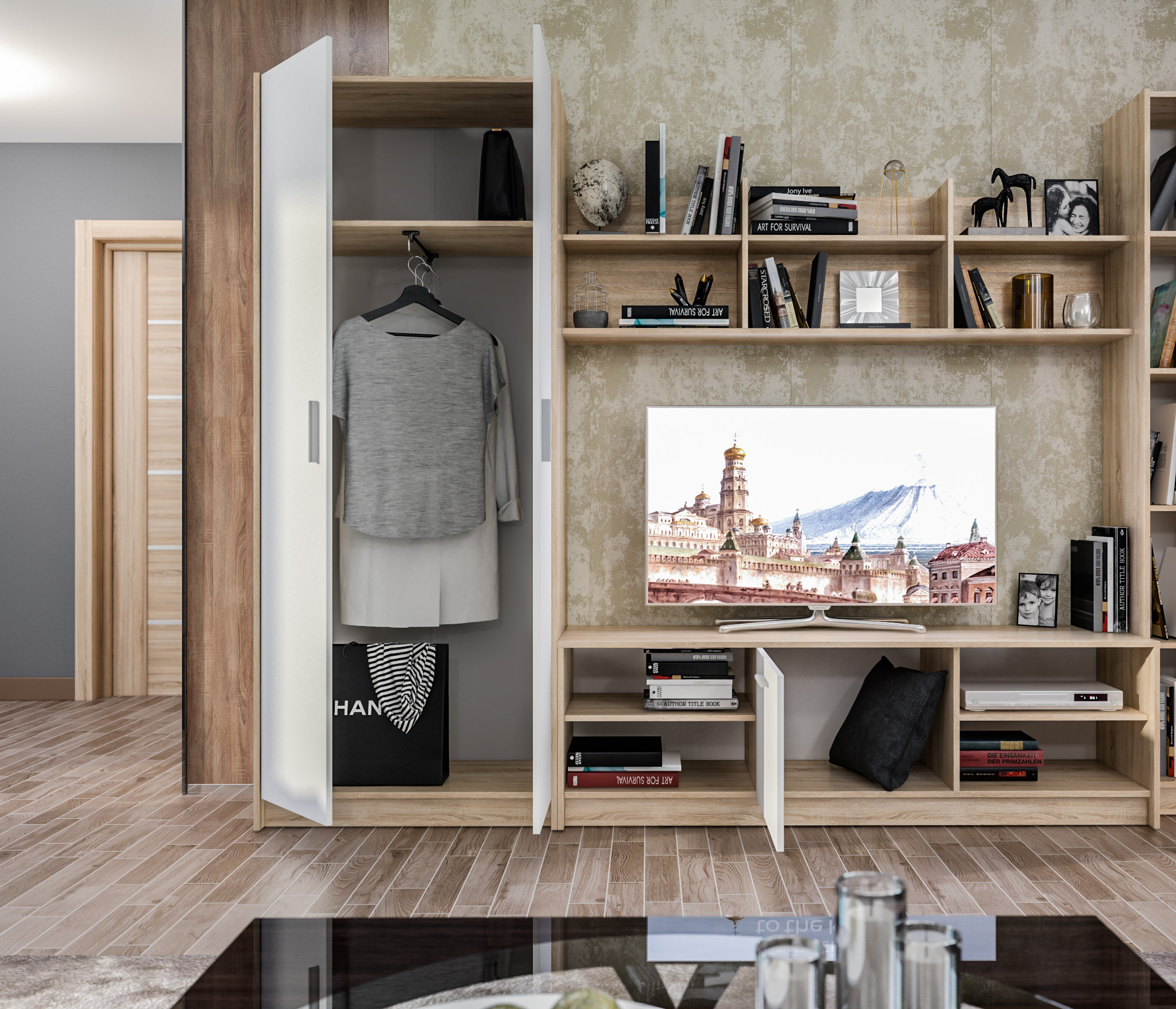 нам очень нравится. пришлось доработать и повесить перегородку выше. сами сделали, потому что розетки закрывала полка для ТВ
