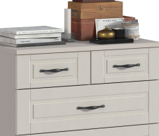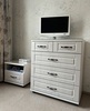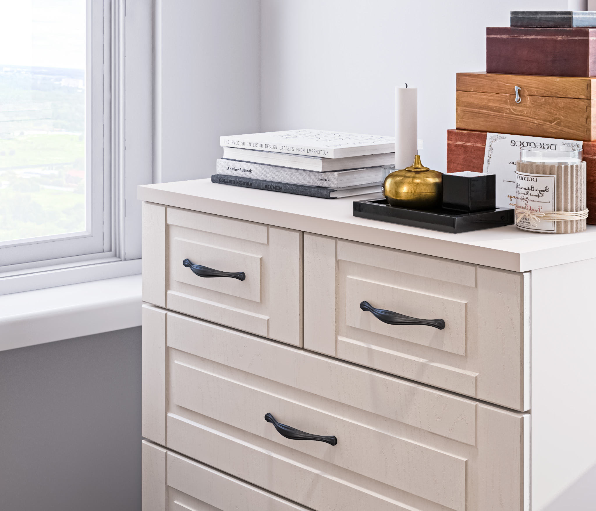 Благодаря светлому цвету фасадных поверхностей и черной матовой фурнитуре, комод Сити смотрится стильно и не громоздко. Фрезерованные фасады из МДФ идеально впишут данную модель как в классический интерьер, так и в интерьер в стиле сканди, Прованс.