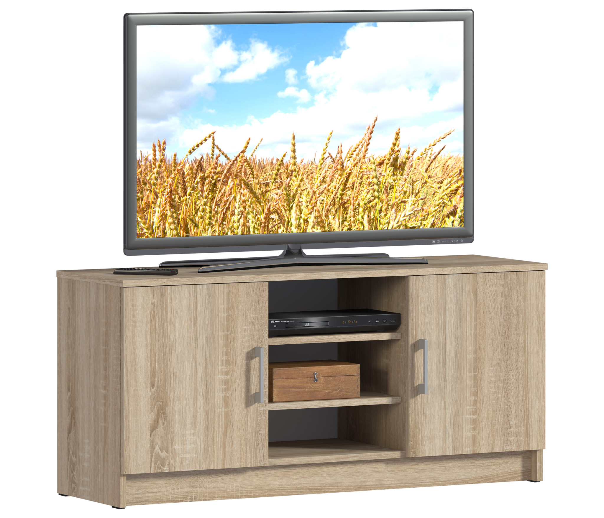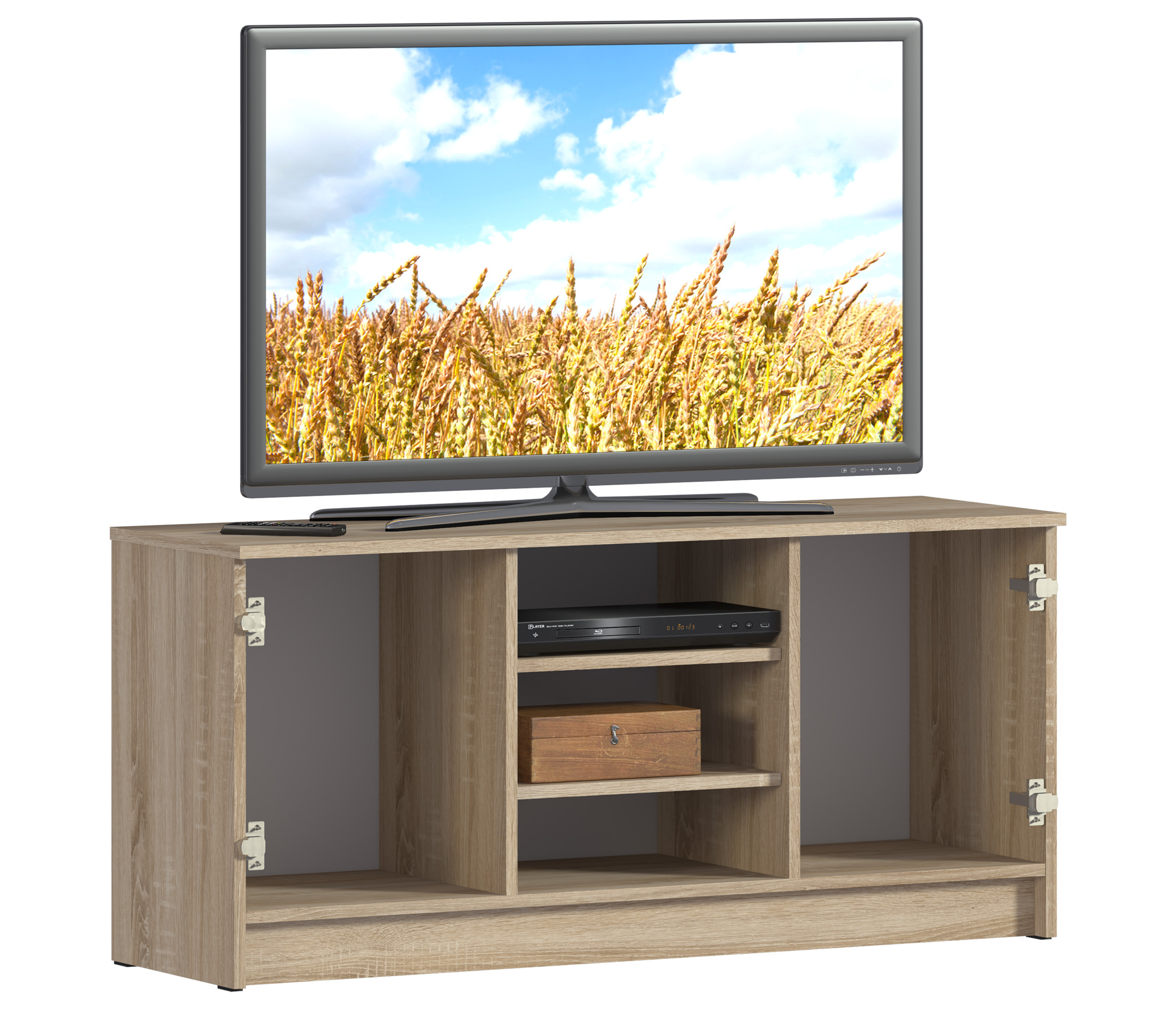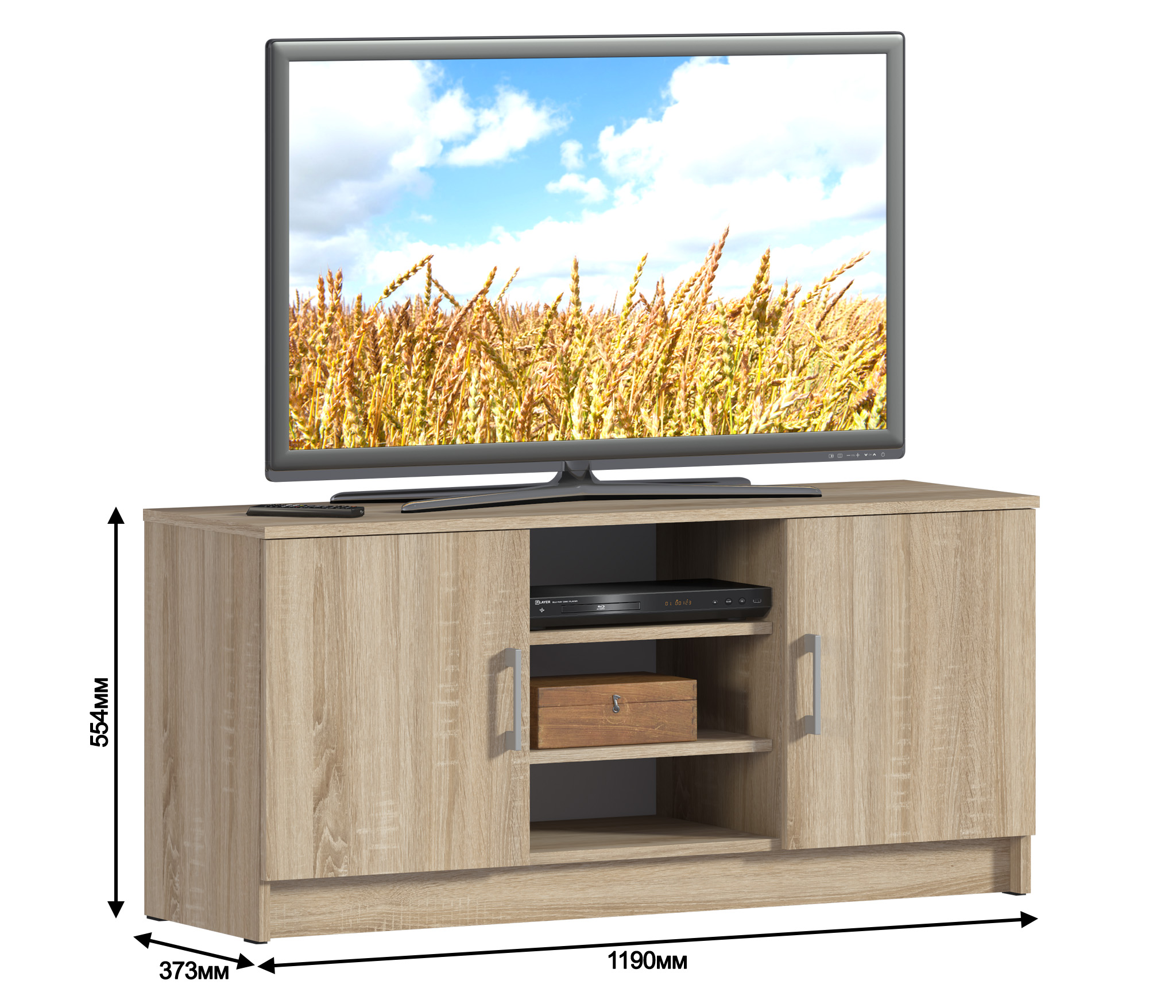 Тумба под телевизор Терра СБ-2959 может быть элементом модульного гарнитура Терра, а может быть автономным предметом мебели в прихожей, гостиной, кабинете или спальне. Габаритные размеры – ширина 119 см, высота 55 см и глубина 37 см. Вес тумбы 25,9 кг, что даёт возможность передвигать её по усмотрению покупателя. Центральное отделение состоит из трех вместительных открытых полок. Боковые симметричные отделения за отдельными дверцами. Тумба выполнена в классическом дизайне из прочного современного материала – КДСП. Материал отделки в цвете "Дуб Сонома". Тумба оснащена протекторами, которые защищают пол от повреждений.