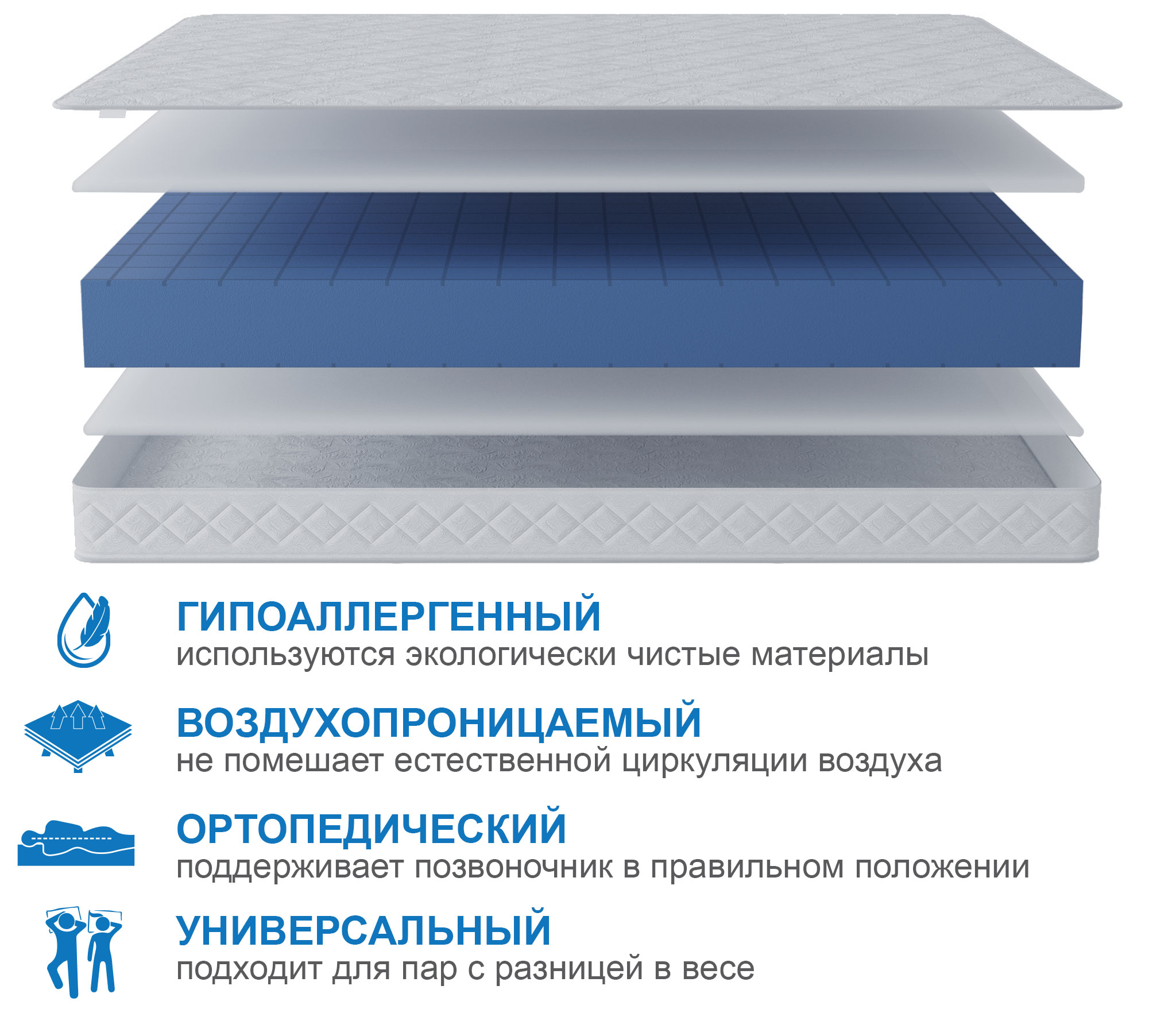 Первый и третий слои состоят из гипоаллергенной пены с прорезями ST Foam, которая создает комфорт и снимает напряжение со спины во время сна. Основа матраса - пена повышенной прочности HD Foam, принимает на себя основную нагрузку.