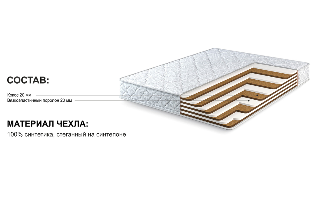 Отличный выбор для людей с весом выше среднего. Это жесткий беспружинный матрас, в состав которого входят как искусственные, так и натуральные материалы. В качестве наполнителя матраса используются 5 слоев латексированной кокосовой койры. Это натуральный материал на основе кокосового волокна, пропитанного натуральным латексом, а также листы высокоэластичной пены. Оба материала жесткие, упругие и очень долговечные. При этом матрас подходит для кроватей с подъемным механизмом. Это идеальный матрас для людей желающих поправить здоровье, улучшить сон и уменьшить боли в суставах. При выборе матраса следует помнить о том, что любой матрас не отвечает за правильность положения головы и шеи, их здоровье зависит от правильно подобранной ортопедической подушки. Для увеличения срока службы матраса рекомендуется его использование с защитным чехлом AquaStop.