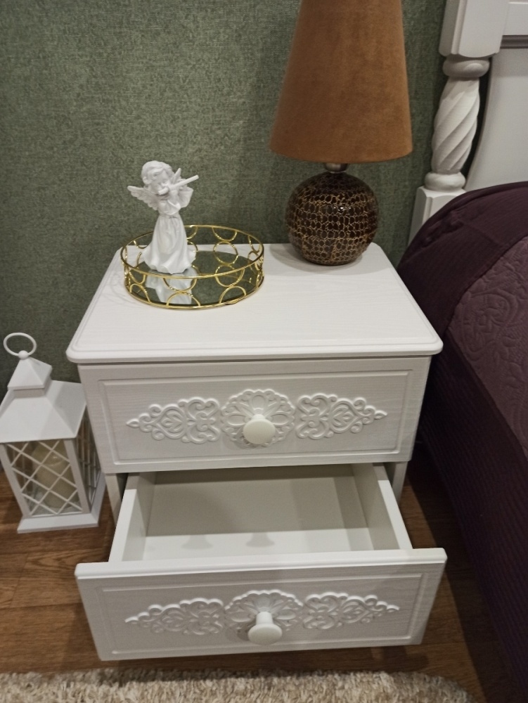 Прикроватная тумба с двумя выдвижными ящиками. Высота боковых стенок каждого ящика 120 мм, ширина ящика 340 мм, глубина 300мм. Ящики установлены на телескопических направляющих полного выдвижени