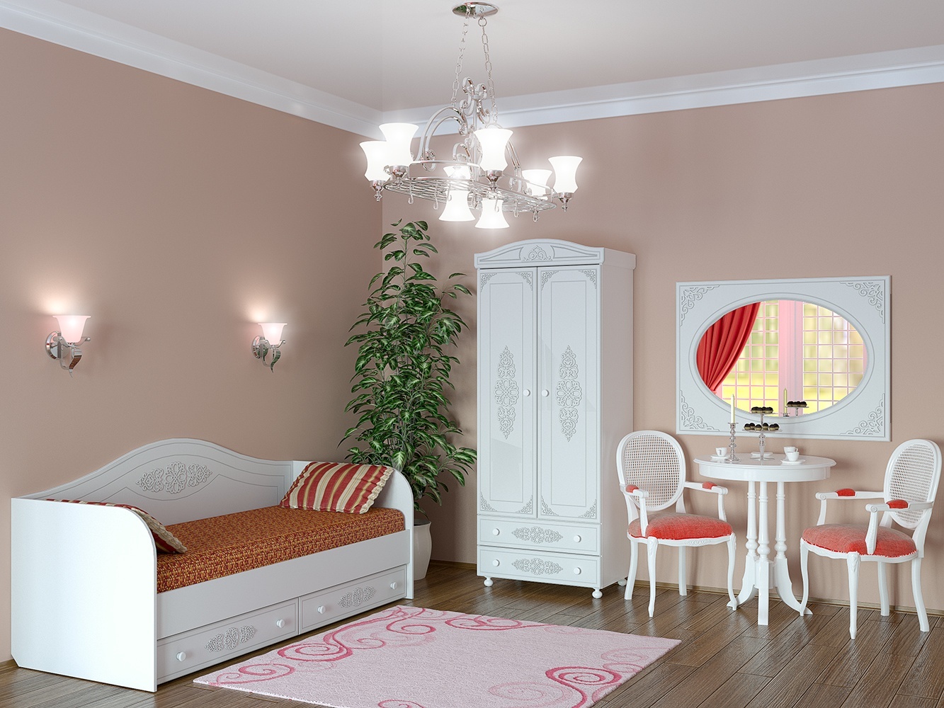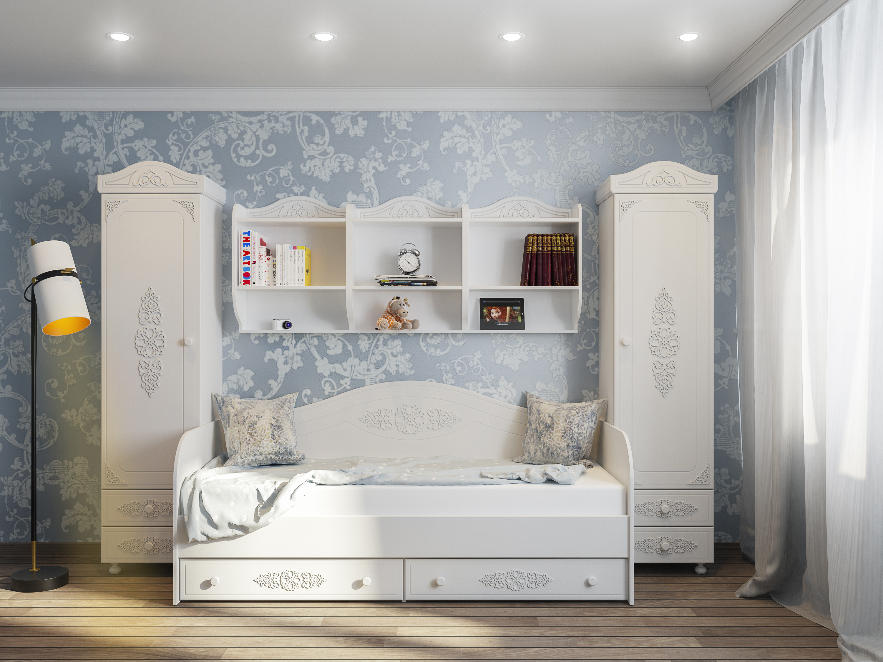 «Ассоль» - мягкий мерцающий глянец и эксклюзивный узор, повторяющийся на фасадах всех модулей идеален для создания нежного уютного интерьера спальни, гостиной, детской, прихожей.