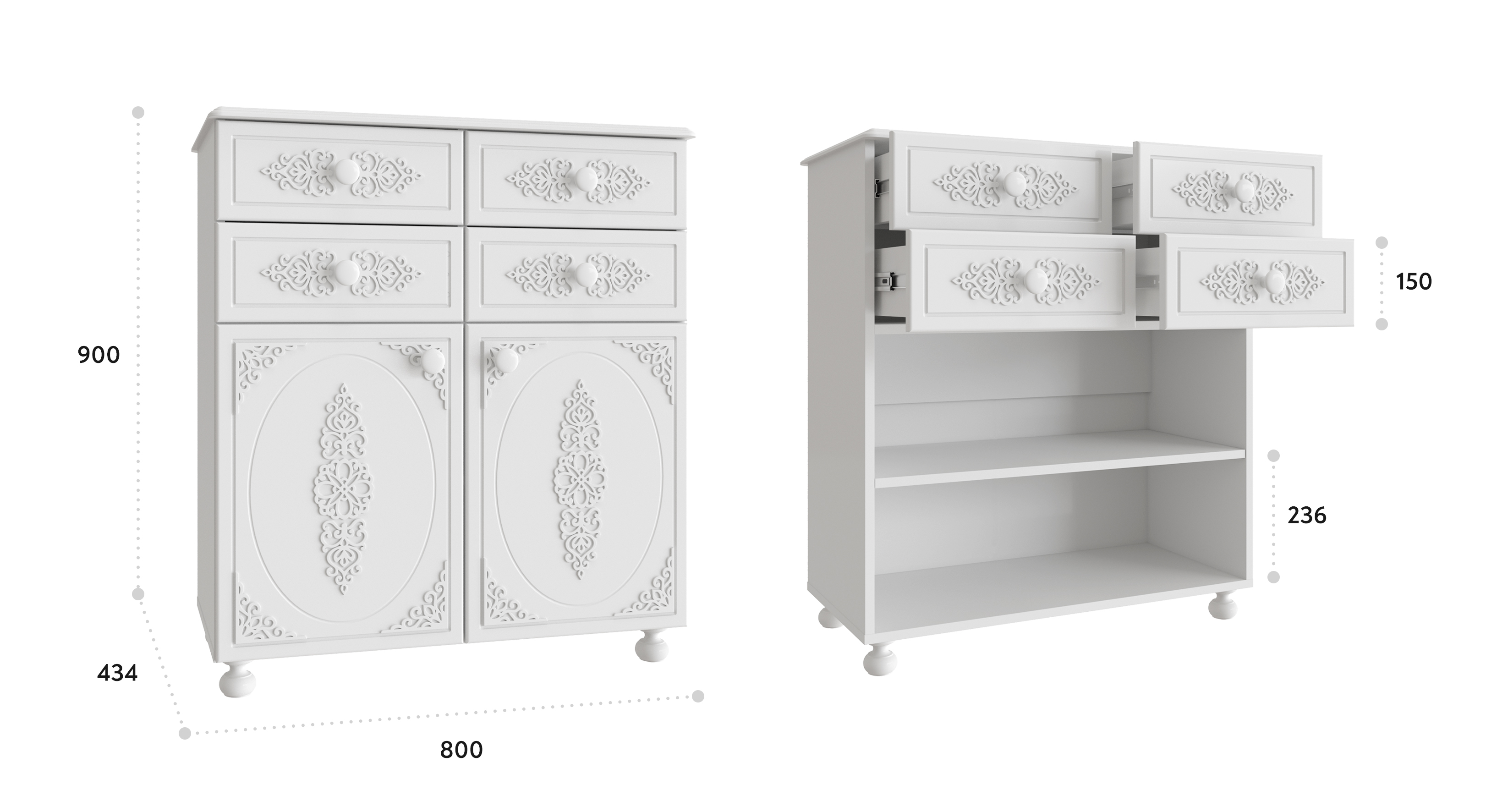 Тумба имеет четыре выдвижных ящика и две распахивающиеся дверцы. Ручки деревянные, гладкие и приятные на ощупь. Тумба установлена на четыре деревянные ножки. Комод из коллекции мебели Ассоль АС-18, несомненно, станет украшением Вашей гостиной, спальни или прихожей. Выдвижные ящики оснащены современными телескопическими направляющими, обеспечивающие плавное и бесшумное выдвижение ящиков, а на дверцах установлены петли с доводчиками. Вы можете создать самостоятельно замечательный мебельный комплект, дополнив комод зеркалом АС-44 или АС-7. В оформлении фасадов МДФ применяется уникальная технология нанесения объемного узора 3D. Высота опоры 65 мм. Фурнитура: петли с доводчиками, телескопические направляющие полного выдвижения.