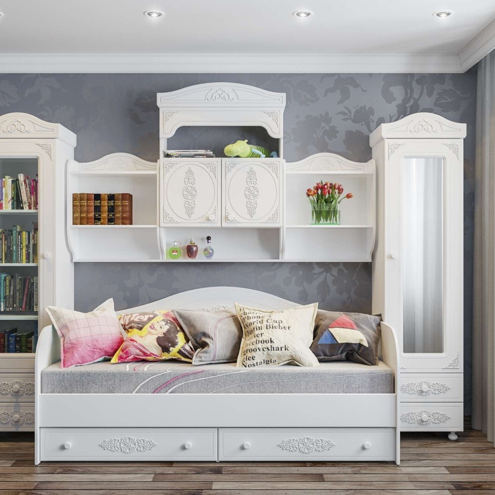 «Ассоль» - мягкий мерцающий глянец и эксклюзивный узор, повторяющийся на фасадах всех модулей идеален для создания нежного уютного интерьера спальни, гостиной, детской, прихожей.