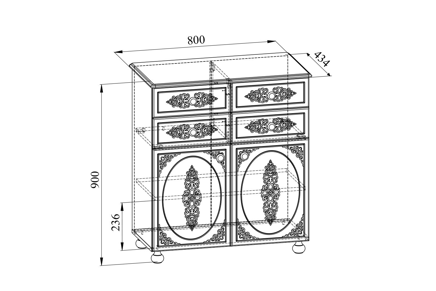 Тумба имеет четыре выдвижных ящика и две распахивающиеся дверцы. Ручки деревянные, гладкие и приятные на ощупь. Тумба установлена на четыре деревянные ножки.