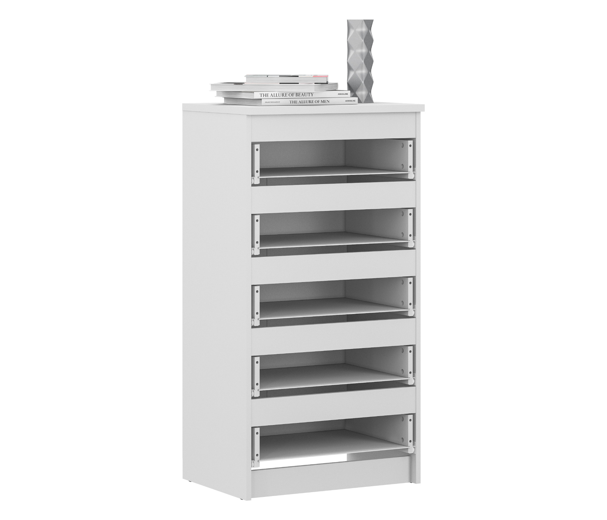Несмотря на визуальную компактность, комод Медея довольно вместителен. Он оснащен пятью выдвижными ящиками. Механизмы ящиков прочные и имеют приличный ресурс. У ящиков нет навесных или прикручивающихся ручек. Белый цвет, минималистичный дизайн придают комоду легкость.