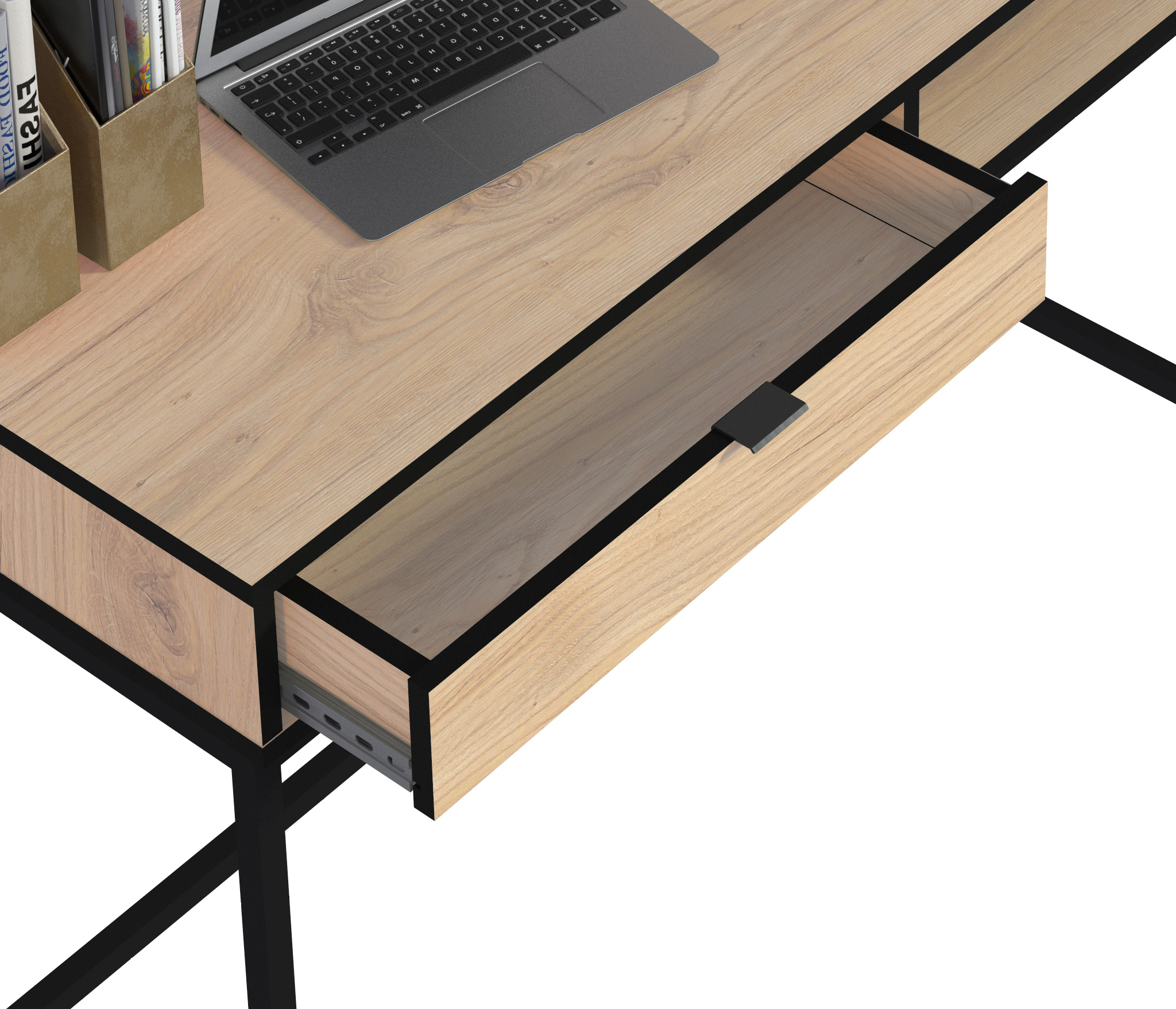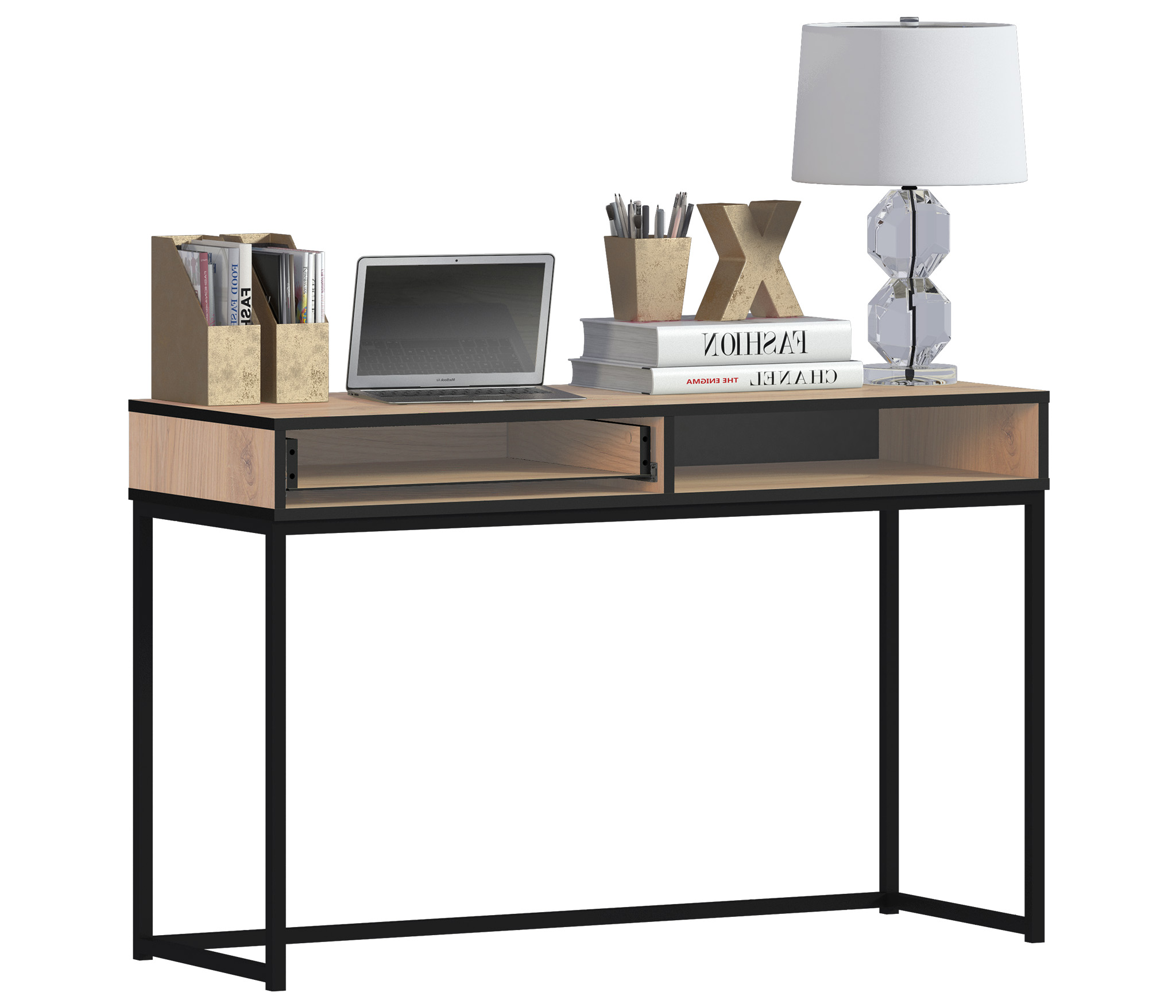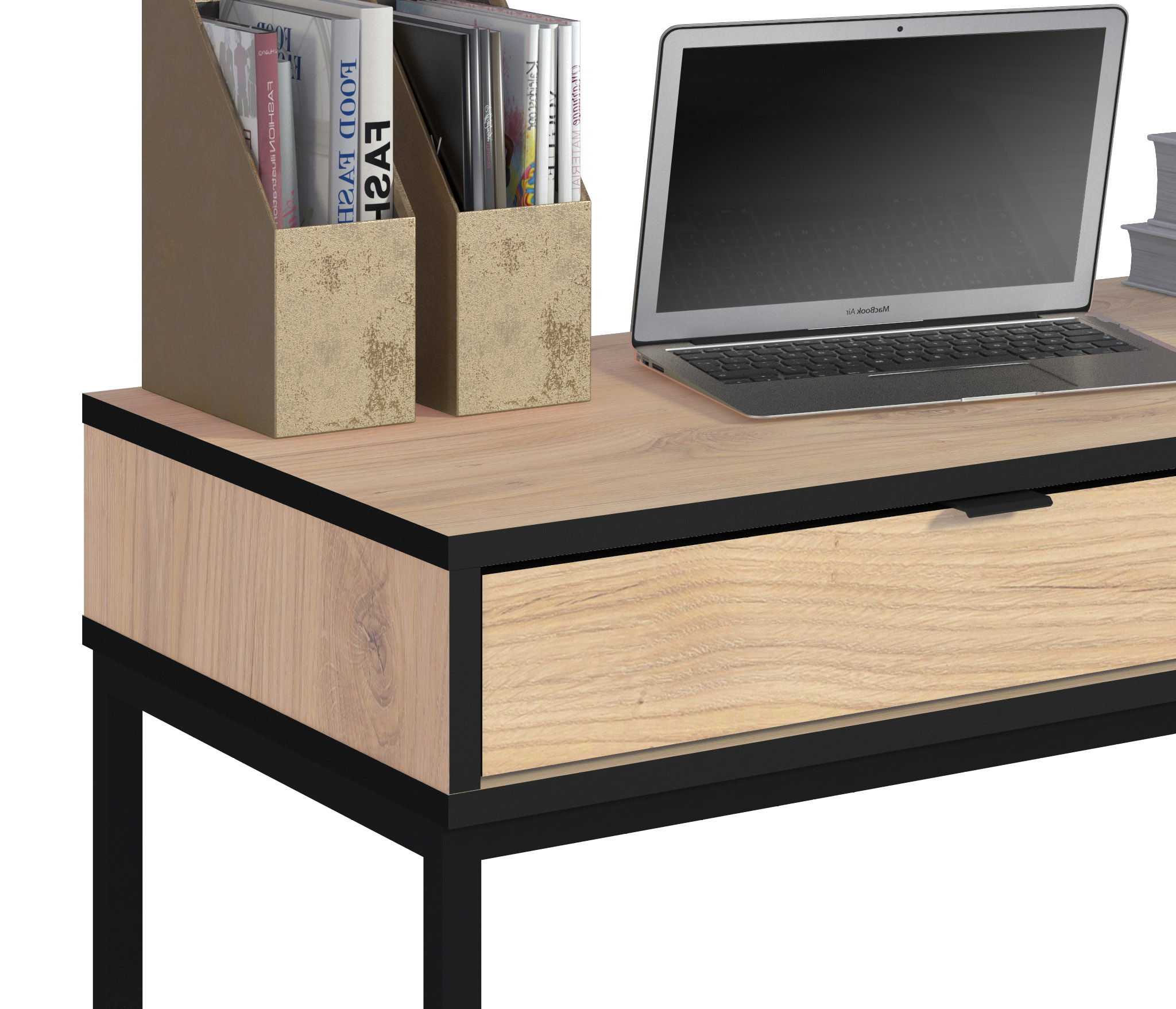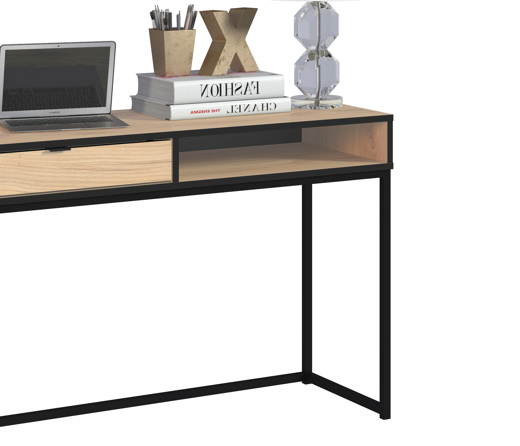 Стол Лофт СБ-3107 можно рассматривать как отдельный предмет мебели, а можно стилизовать его в гарнитуре. Стол достаточно компактен – ширина 119 см, высота 76 и ширина 44 см. Под рабочей поверхностью расположены открытая полка и выдвижной ящик для хранения книг, журналов, документов. Стол выполнен в, стиле Лофт и будет органично смотреться как в комнате школьника или студента, так и в кабинете или офисе. Материал ЛДСП цвет Дуб Минерва. Ножки металлические в черном цвете.