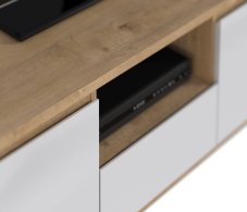 Габаритные размеры – ширина 140 см, высота 44 см и глубина 44 см. Вес тумбы 33,92 кг, что даёт возможность передвигать её по усмотрению. Визуально тумбу можно разделить на три отделения. В центре над выдвижным ящиком расположена открытая полка. По бокам два вместительных отделения за отдельными дверцами. Отличительной особенностью тумбы является отсутствие ручек, которые интегрированы в фасады. ¶Тумба выполнена в лаконичном дизайне из экологичного современного ЛДСП. Материал отделки устойчив к влаге и воздействию бытовых чистящих средств, что актуально для светлых поверхностей.