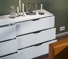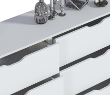 Комод для вещей относится к стильной и элегантной коллекции "Бруклин". Комод выполнен в белом цвете, что делает модель универсальной и актуальной для долгого периода времени. Данный комод с ящиками можно использовать не только для одежды: установите мебель в детскую и используйте комод для игрушек, в гостиной комод может использоваться как дополнительная поверхность для установки телевизора или приятных сердцу вещей интерьера, а вместе с тем - прятать от посторонних глаз личные вещи. Модель Бруклин подойдет даже для ванной, поскольку сделана из ЛДСП и не боится влажности. Разместите в ящиках все многочисленные баночки и тюбики, и избавьтесь от полочек, висящих над ванной, которые регулярно задеваешь рукой. Ну а если разместить комод в спальне, благодаря его вместительным размерам 39х156х75 см, в ящиках получится спрятать не только одежду, но и полотенца и даже постельное белье.