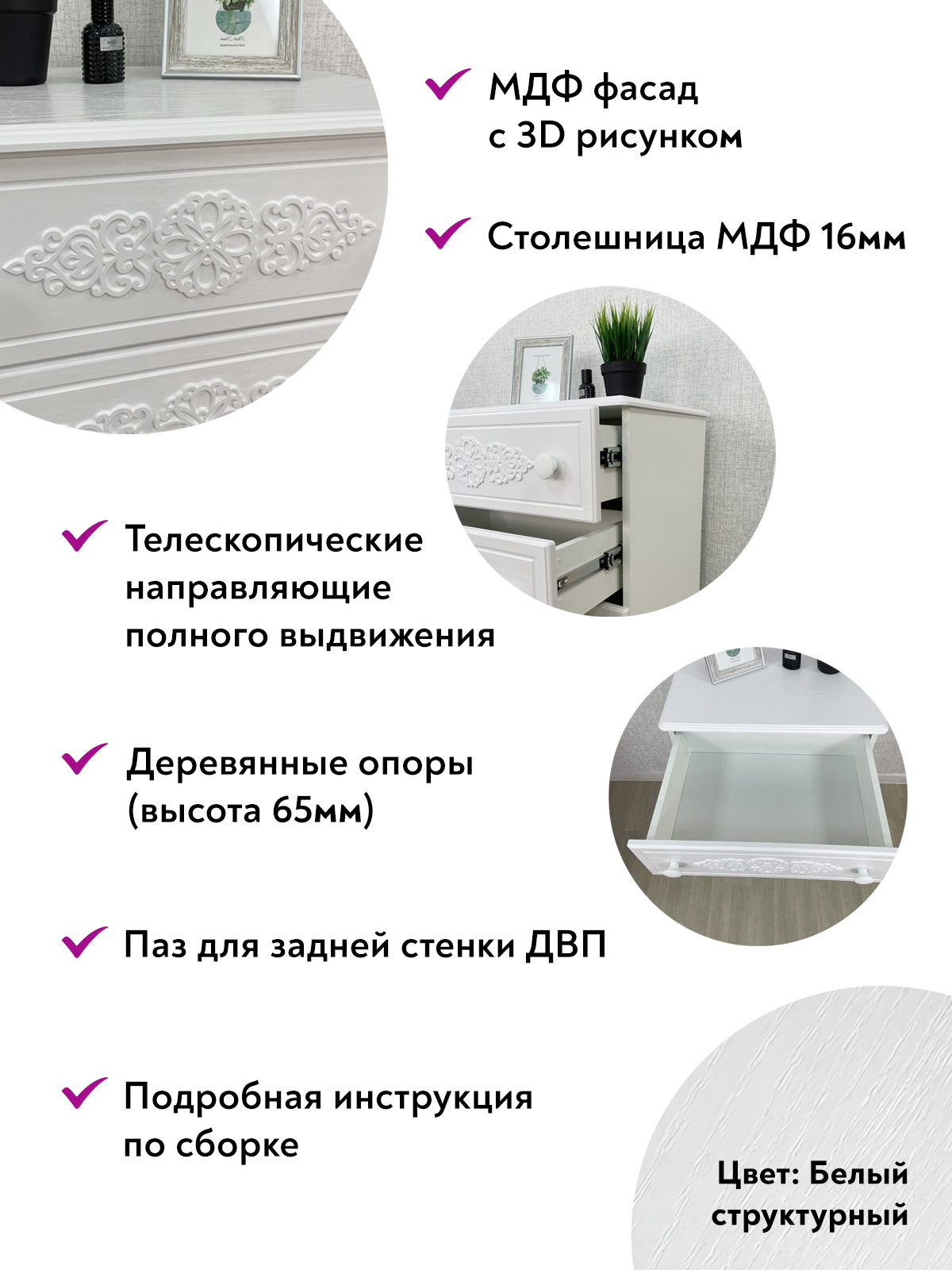 Роскошный комод из коллекции мебели Ассоль АС-62, несомненно, станет украшением Вашей гостиной или спальни. Выдвижные ящики оснащены современными телескопическими направляющими, обеспечивающие плавное и бесшумное выдвижение просторных ящиков. Распашные дверцы имеют качественные петли с плавными доводчиками закрывания. Фурнитура: петли с доводчиками, телескопические направляющие полного выдвижения. Высота опоры 65 мм. Мебель изготовлена из качественной ламинированной ДСП 16 мм. В оформлении фасадов МДФ применяется уникальная технология нанесения объемного узора 3D.