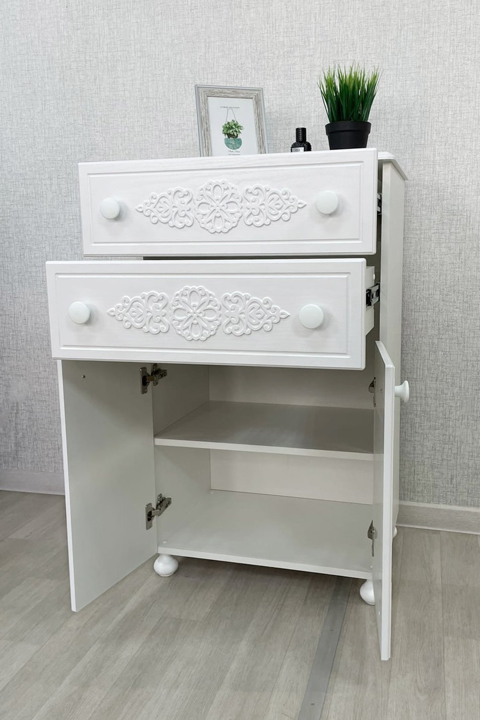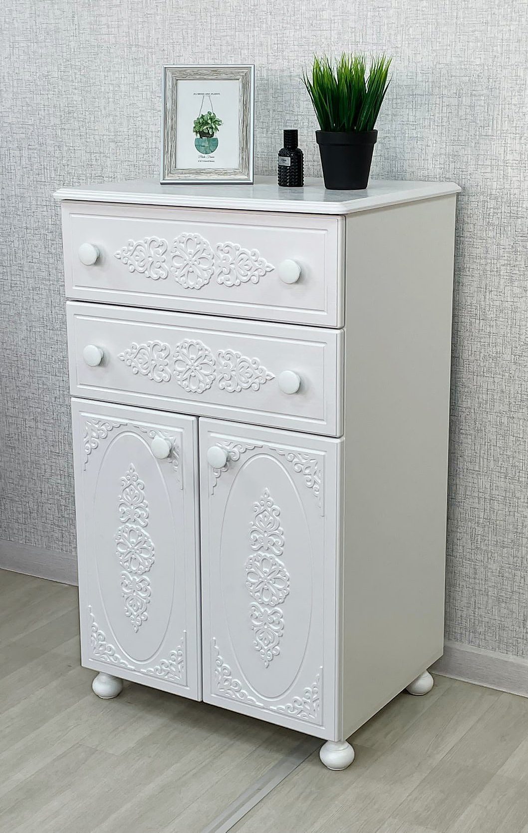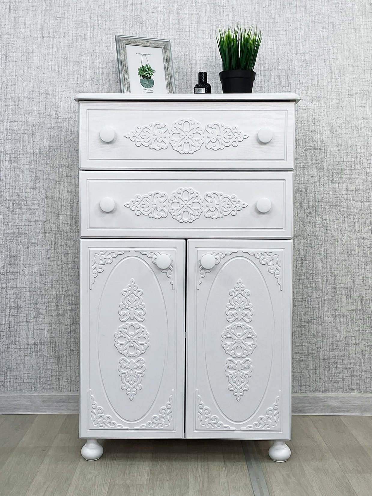 Роскошный комод из коллекции мебели Ассоль АС-63, несомненно, станет украшением Вашей гостиной или спальни. Выдвижные ящики оснащены современными телескопическими направляющими, обеспечивающие плавное и бесшумное выдвижение просторных ящиков. Распашные дверцы имеют качественные петли с плавными доводчиками закрывания. Фурнитура: петли с доводчиками, телескопические направляющие полного выдвижения. Высота опоры 65 мм. Мебель изготовлена из качественной ламинированной ДСП 16 мм. В оформлении фасадов МДФ применяется уникальная технология нанесения объемного узора 3D.