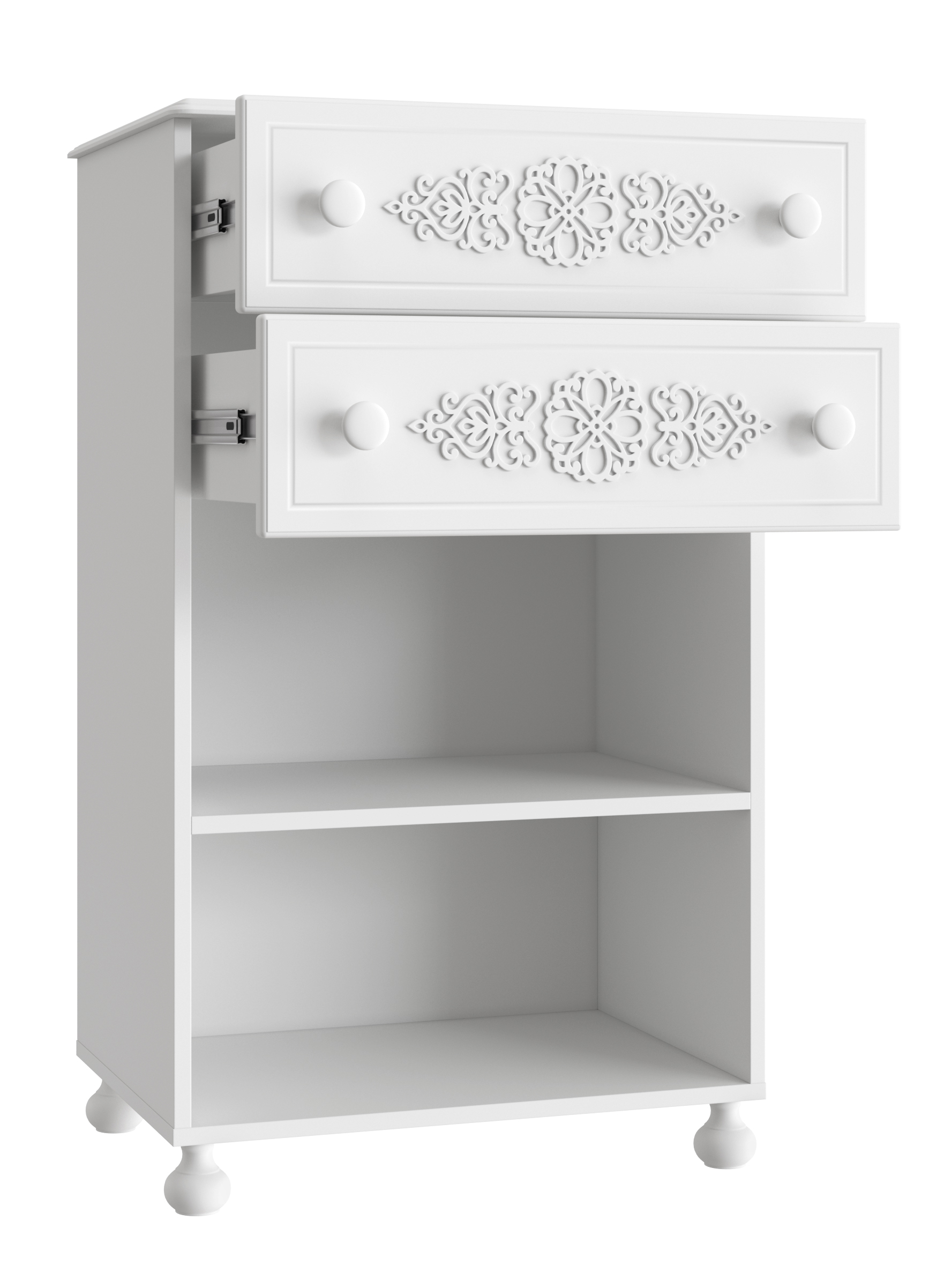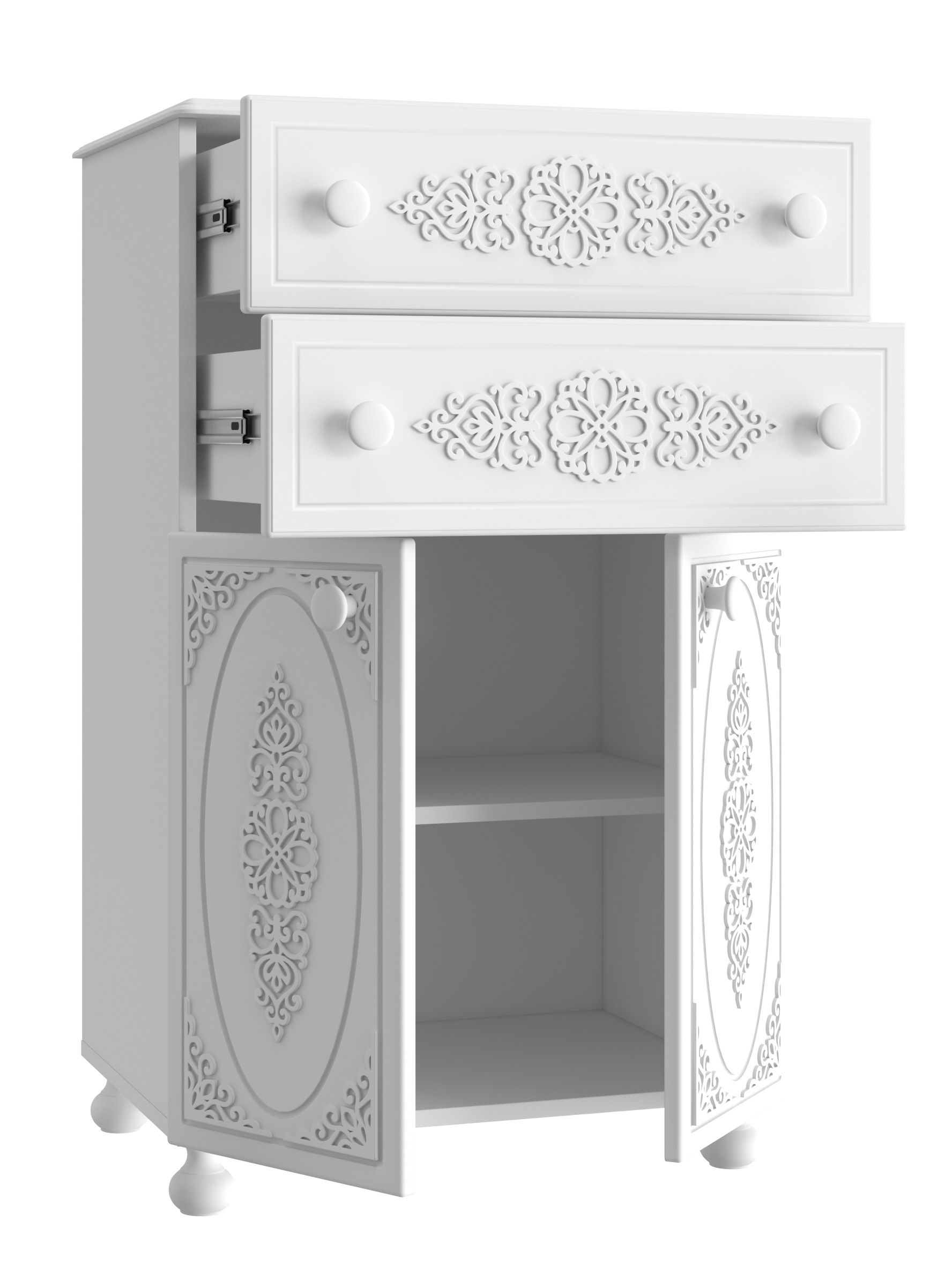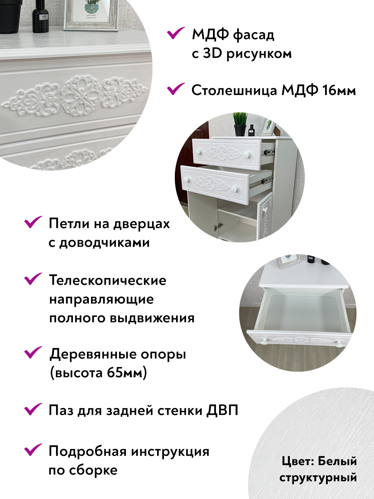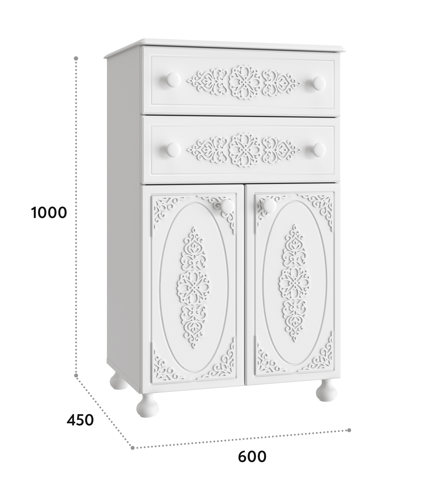 Роскошный комод из коллекции мебели Ассоль АС-63, несомненно, станет украшением Вашей гостиной или спальни. Выдвижные ящики оснащены современными телескопическими направляющими, обеспечивающие плавное и бесшумное выдвижение просторных ящиков. Распашные дверцы имеют качественные петли с плавными доводчиками закрывания. Фурнитура: петли с доводчиками, телескопические направляющие полного выдвижения. Высота опоры 65 мм. Мебель изготовлена из качественной ламинированной ДСП 16 мм. В оформлении фасадов МДФ применяется уникальная технология нанесения объемного узора 3D.