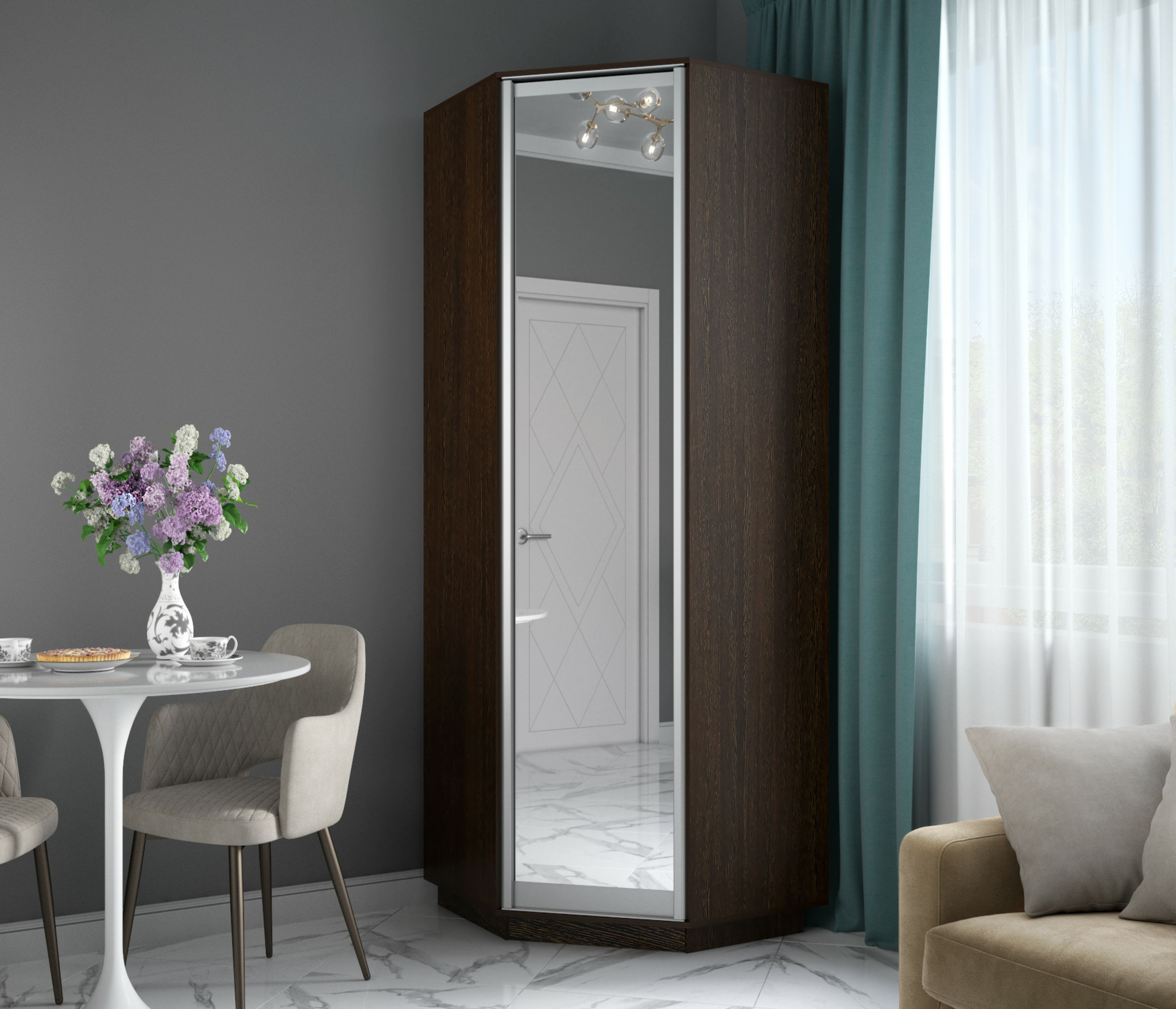 Лаконичный дизайн: монолитный трехпанельный фасад с распашной дверью украшает полноразмерное зеркало в алюминиевом профиле;
