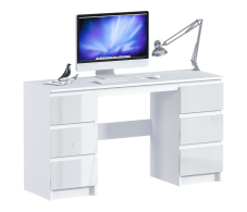 Компьютерный стол Медея СБ-3337 – удобное и продуманное рабочее место. Он не займет много места в кабинете, комнате школьника или студента, а также будет уместным в офисе. Габаритные размеры стола Медея – ширина 135 см, высота 75 см, глубина 44 см. Под рабочей поверхностью расположены две тумбы с тремя выдвижными ящиками каждая. Стол выполнен в минималистичном дизайне. Сам корпус в белом цвете, фасадные поверхности – в цвете «Белый глянец». Материал отделки устойчив к влаге, что оптимально для мебели белого цвета.