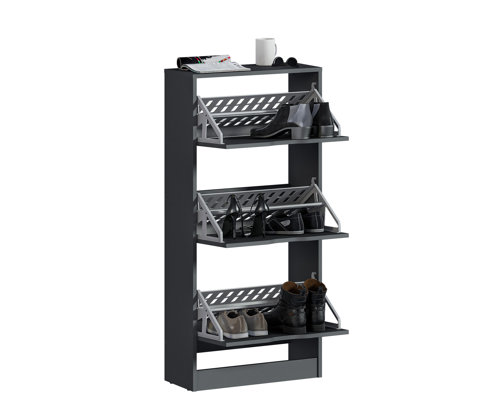 Габаритные размеры – ширина 59 см, высота 126 см и глубина 25 см. Обувница имеет три отделения, каждое из которых оснащено специальными стойками для хранения обуви. Прорезные ручки и строгие геометрические формы позволяют вписать обувницу в любой интерьер. Обувница произведена из экологичного прочного КДСП, устойчивого к мелким механическим повреждениям.