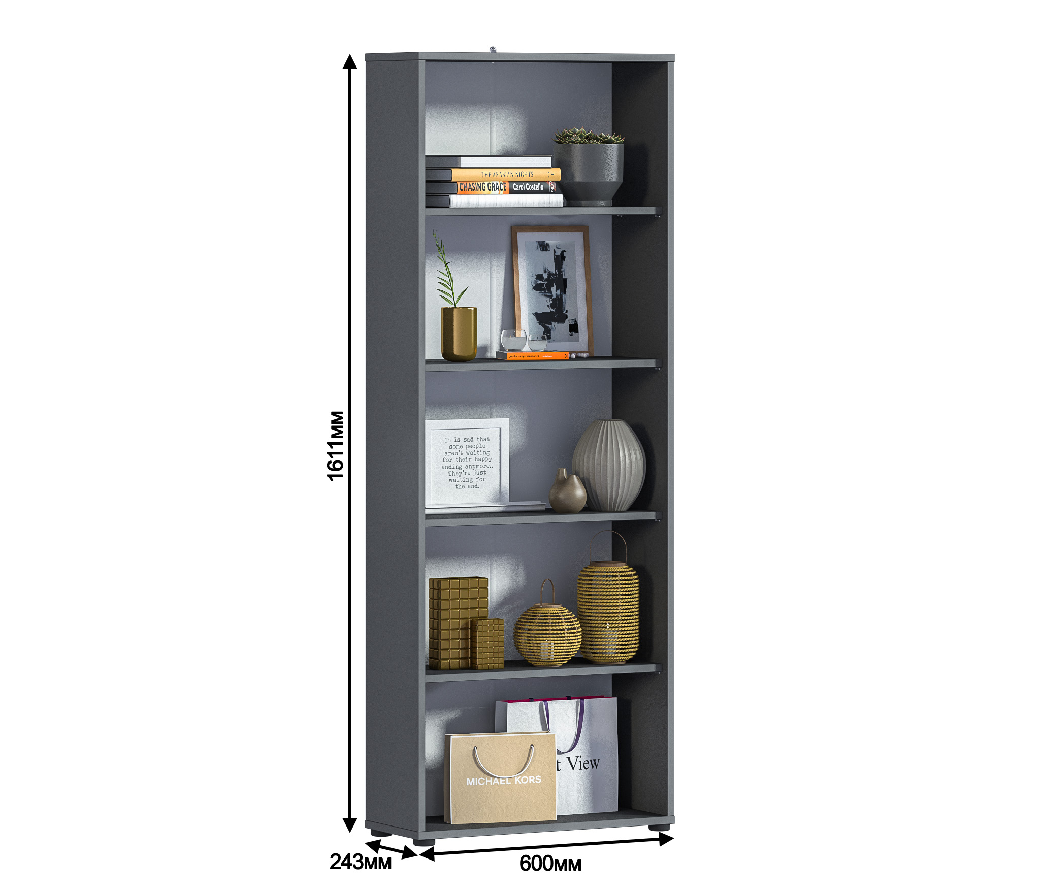 Габаритные размеры – ширина 60 см, высота 161,1 см и глубина 24,3 см. На шести открытых просторных полках можно без труда разместить книги, журналы, сувениры и множество памятных предметов.