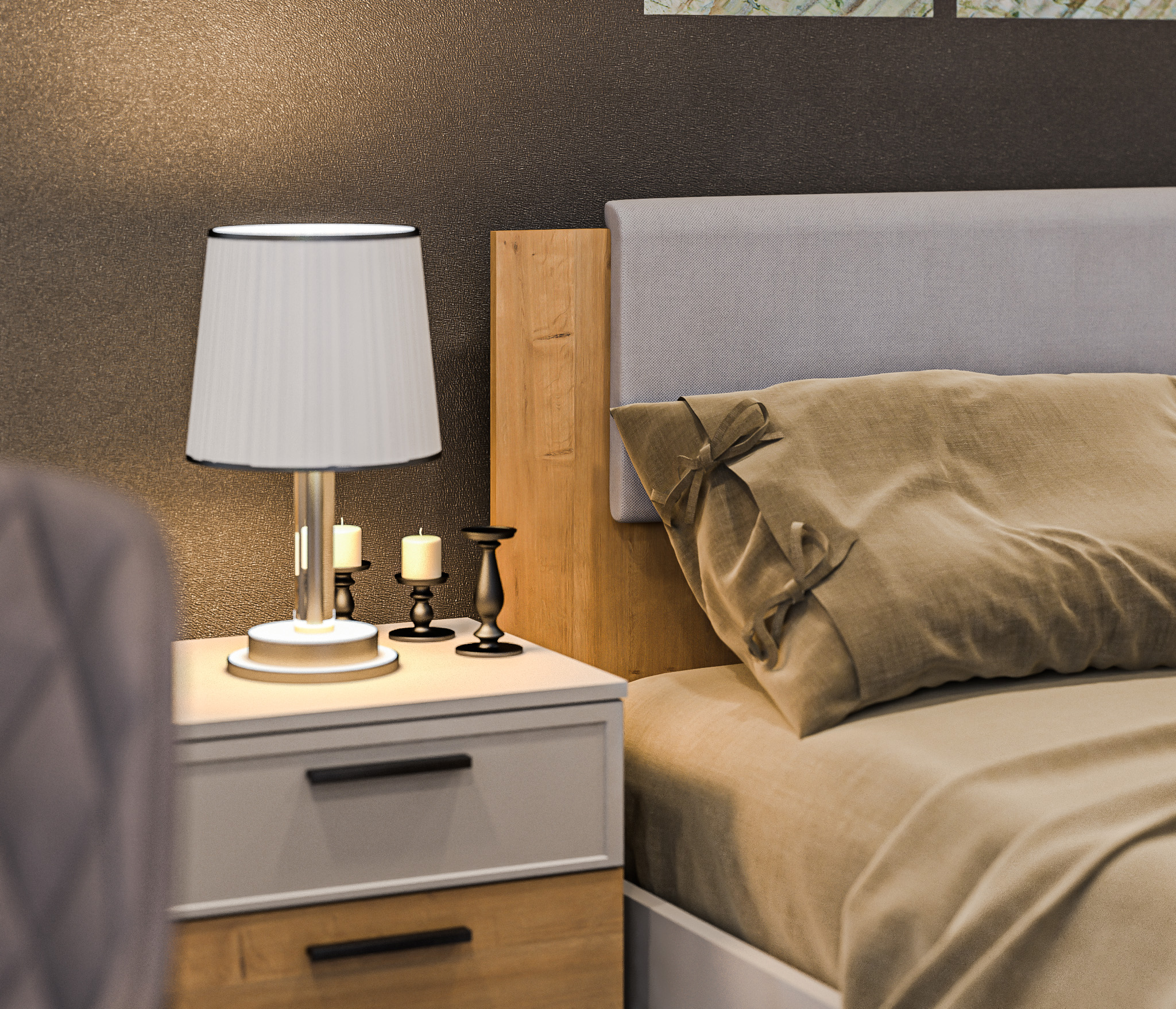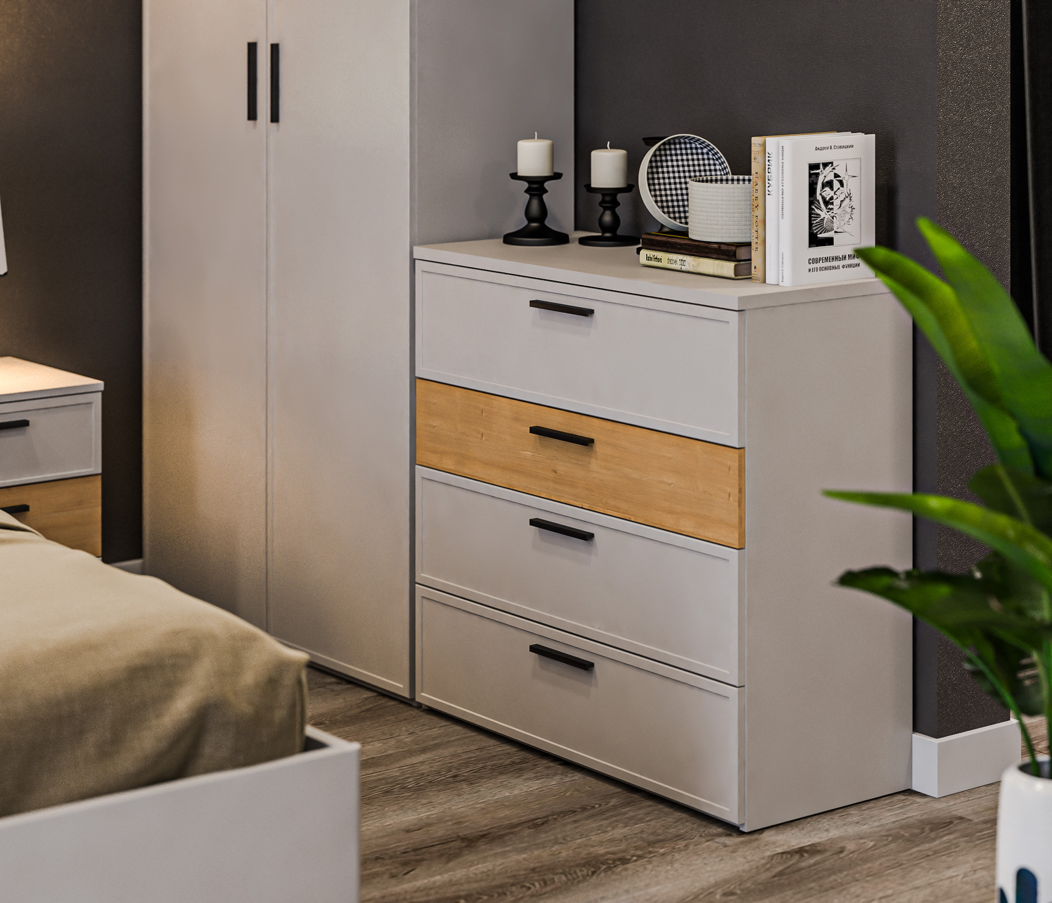 Милан СБ-3270 Кровать (1600) Серый,Дуб ГамильтонМилан СБ-3295 Тумба с ящиками Серый/Дуб Гамильтон,МДФ Светло серый
