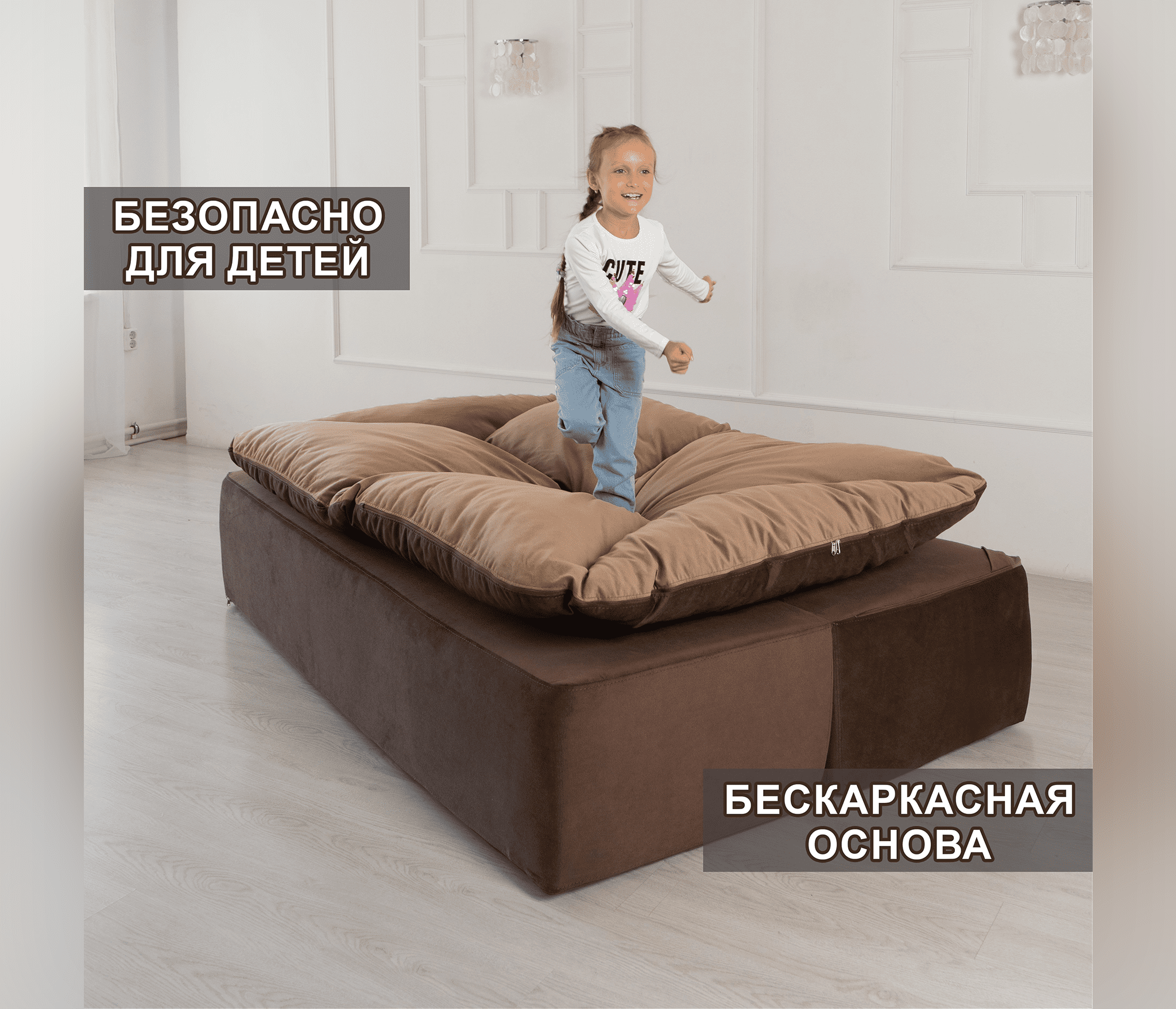 В-третьих, абсолютно безопасный для детей – в нем все детали мягкие, не острых углов. Диван без каркаса не вызывает аллергии, так как для его производства не используются ДСП и прочие материалы с резким запахом и формальдегидами.
