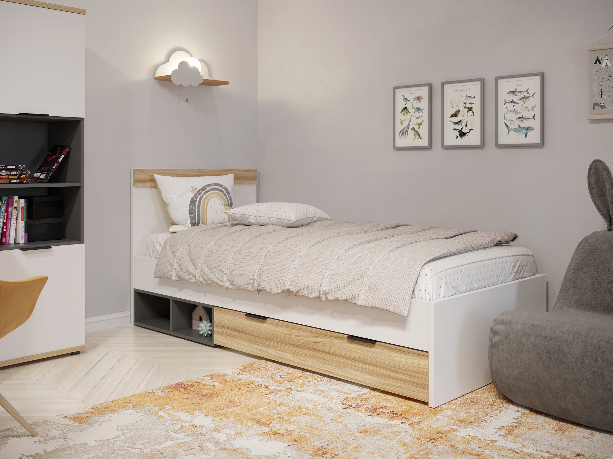 Кровать односпальная Скайлайт СЛ-32 идеальна для детской и подростковой комнаты. Кровать имеет высокое изголовье. Высота изножья 400 мм. Фасады и царги изготовлены из ЛДСП 16 мм. Кровать имеет один выкатной ящик глубиной 766 мм для хранения вещей, игрушек или постельного белья. Две дополнительных ниши в цвете серый графит могут быть использованы для хранения вещей, игрушек и книг.