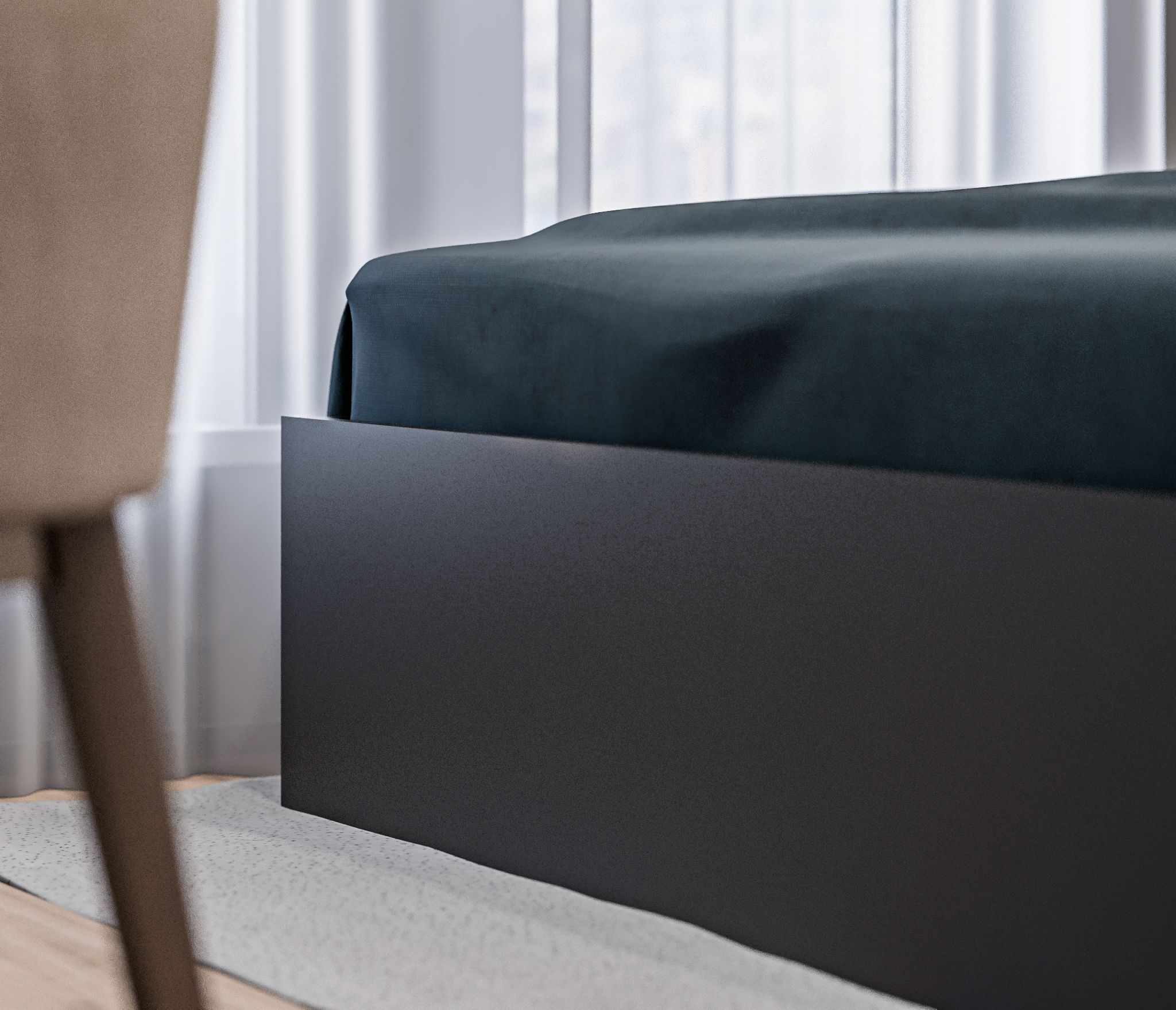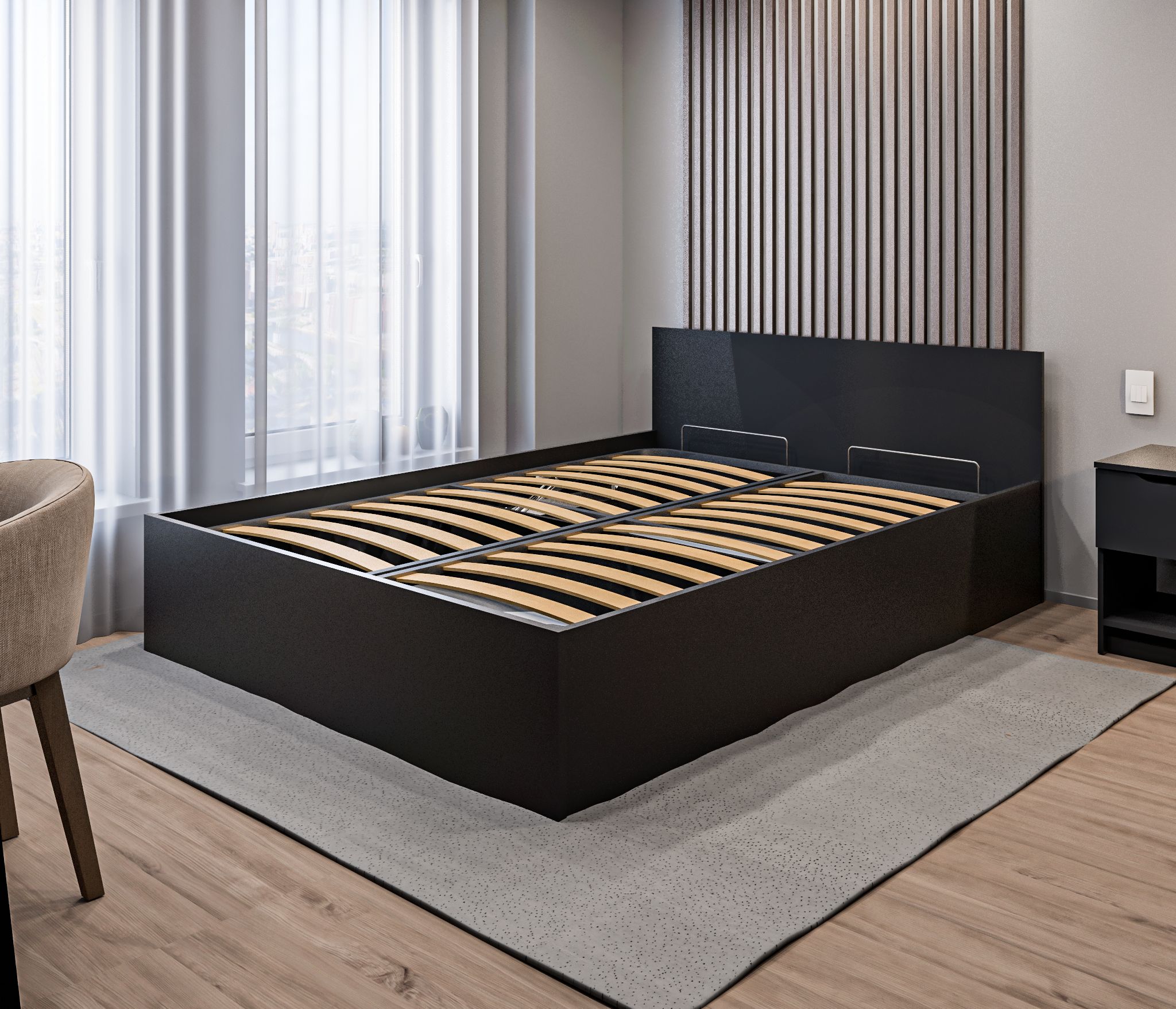 Качественный материал, минималистический дизайн, большое пространство для хранения, легкая сборка, удобно, что комплект кровати упакован в три разных коробки - легко перевозить и заносить в помещение в одиночку